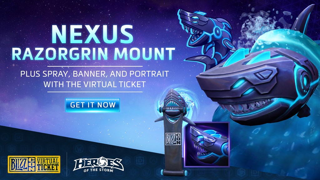Effrayez vos adversaires en chevauchant à travers le Nexus sur la nouvelle monture métallique Trancherictus du Nexus, et ajoutez le tag Trancherictus du Nexus dessin animé à votre collection, ainsi qu’une bannière et un portrait de la BlizzCon 2018.