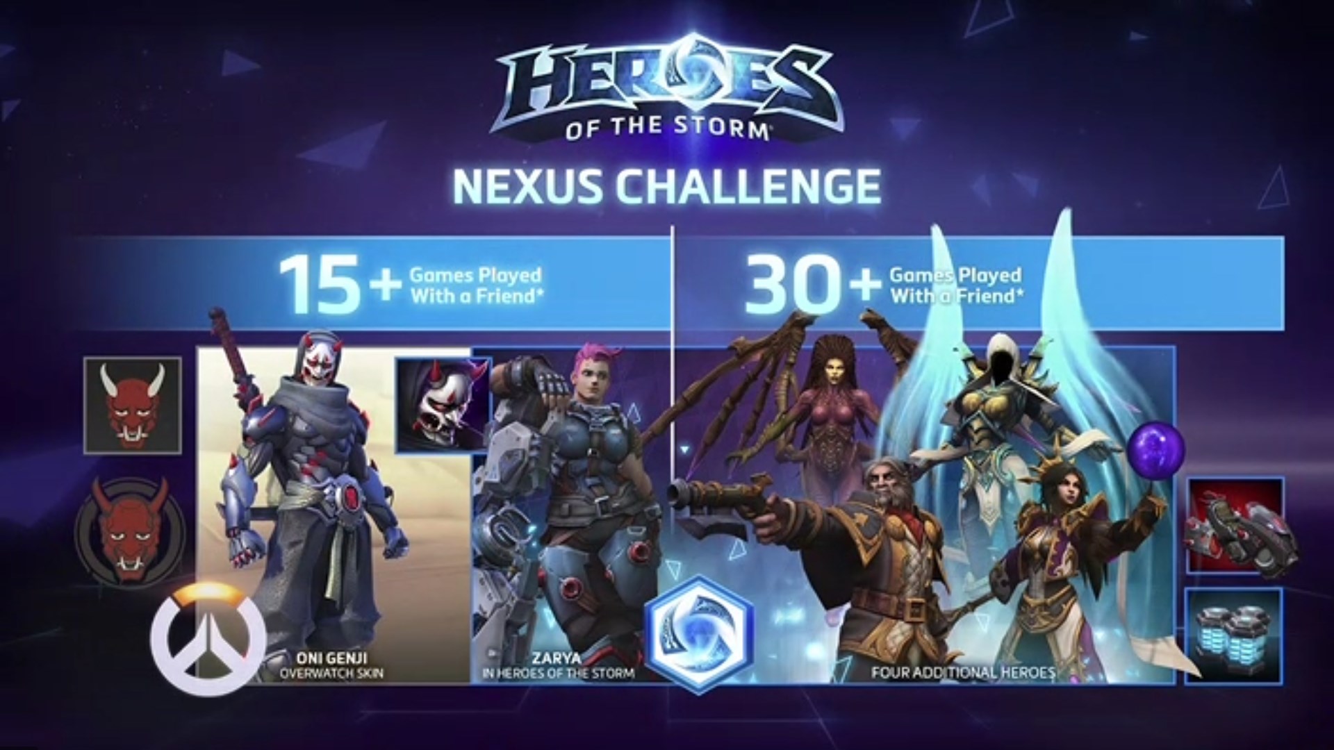- Le Nexus challenge sera un nouveau mode : Jouez 15 parties avec un ami, repartez avec un skin de Genji sur Overwatch ainsi que Zarya dans Heroes. Remportez 30 parties vous rapportera encore plus de héros.