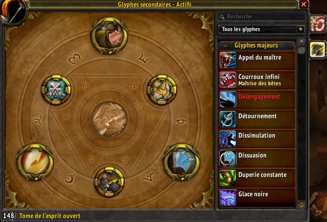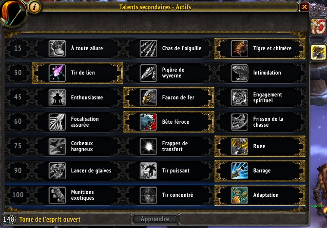 Sur cet onglet, nous vous présentons les choix de talents et glyphes viables pour les Hunt BM au patch 6.2. Nous détaillerons ce que chacun des talents et glyphes peut faire et dans quelles situations ils devraient être utilisés.