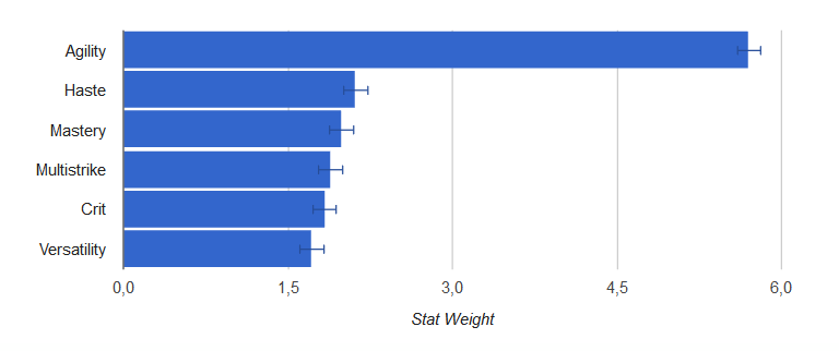 Pour tous les amoureux de « theorycrafting », utilisateurs du site/addon « AskMrRobot », sachez que vous pouvez aller plus loin concernant le poids de chaque stats dans votre optimisation. La pondération des statistiques suivantes a été obtenue en combinant le sens commun, les tests en cours sur le jeu, et des simulations en utilisant le site « Simcraft ».