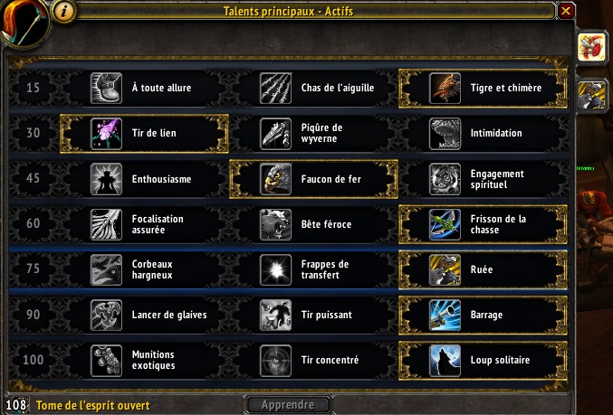 Sur cet onglet, nous vous présentons les choix de talents et glyphes viables pour les Chasseurs Précision au patch 6.2. Nous détaillerons ce que chacun des talents et glyphes peut faire et dans quelles situations ils devraient être utilisés.