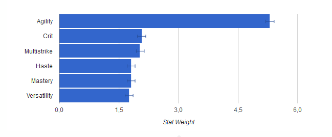 Alors certe, Critique et Frappe multiples sont les stats qui suivent, mais l’Agilité reste la plus importante. Même si la Hâte et la Maîtrise ne sont pas celles qui ont le plus gros poids dans le calcul global, elles ne sont pas non plus à négliger étant donné que la Hâte fera baisser ton GCD et augmentera ton taux de régénération de Focalisation et que la Maîtrise (en Précision) influencera directement tes Coups Critiques.