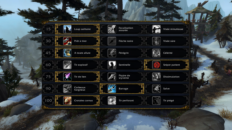 Sur cet onglet, nous vous présentons les choix de talents viables pour le Chasseur Précision à la pré-mise à jour 7.0.3. Nous détaillerons ce que chacun des talents peut faire et dans quelles situations ils devraient être utilisés.