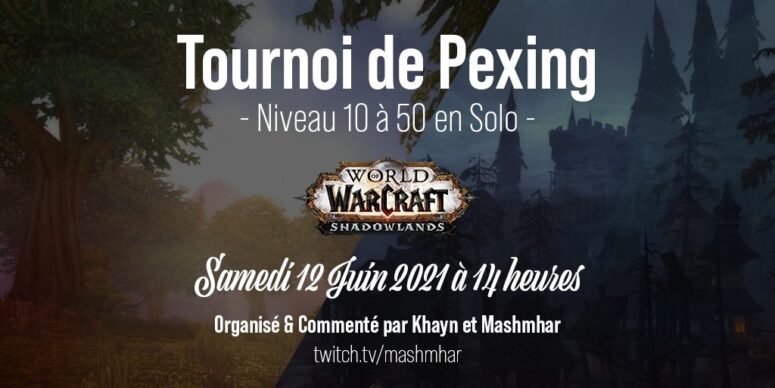 En attendant l'arrivée de la prochaine mise à jour 9.1 de Shadowlands, un tournoi de pexing est organisé du niveau 10 à 50 en solo par deux membres de la communauté de World of Warcraft avec Khayn et Mashmhar pendant la journée du samedi 12 juin 2021, de 14 heures à 18 heures. Avec le soutien de l'équipe de Blizzard, plusieurs lots seront mis en jeu pour les 5 premières équipes gagnantes : temps de jeu, mascottes, montures et jouets de la boutique officielle. Pendant une course de 4 heures diffusée sur Twitch ou Youtube, les participants devront ainsi monter au plus haut niveau pour tenter de remporter le tournoi. Depuis la refonte de l'expérience à Shadowlands, les stratégies pour emporter la victoire sont multiples mais plusieurs règles sont mises en place pour mettre les participants sur le même pied d'égalité. Notez que vous pouvez également participer en suivant la diffusion sur Twitch par Khayn depuis votre canapé pour suivre les participants en direct dans cette course commentée.