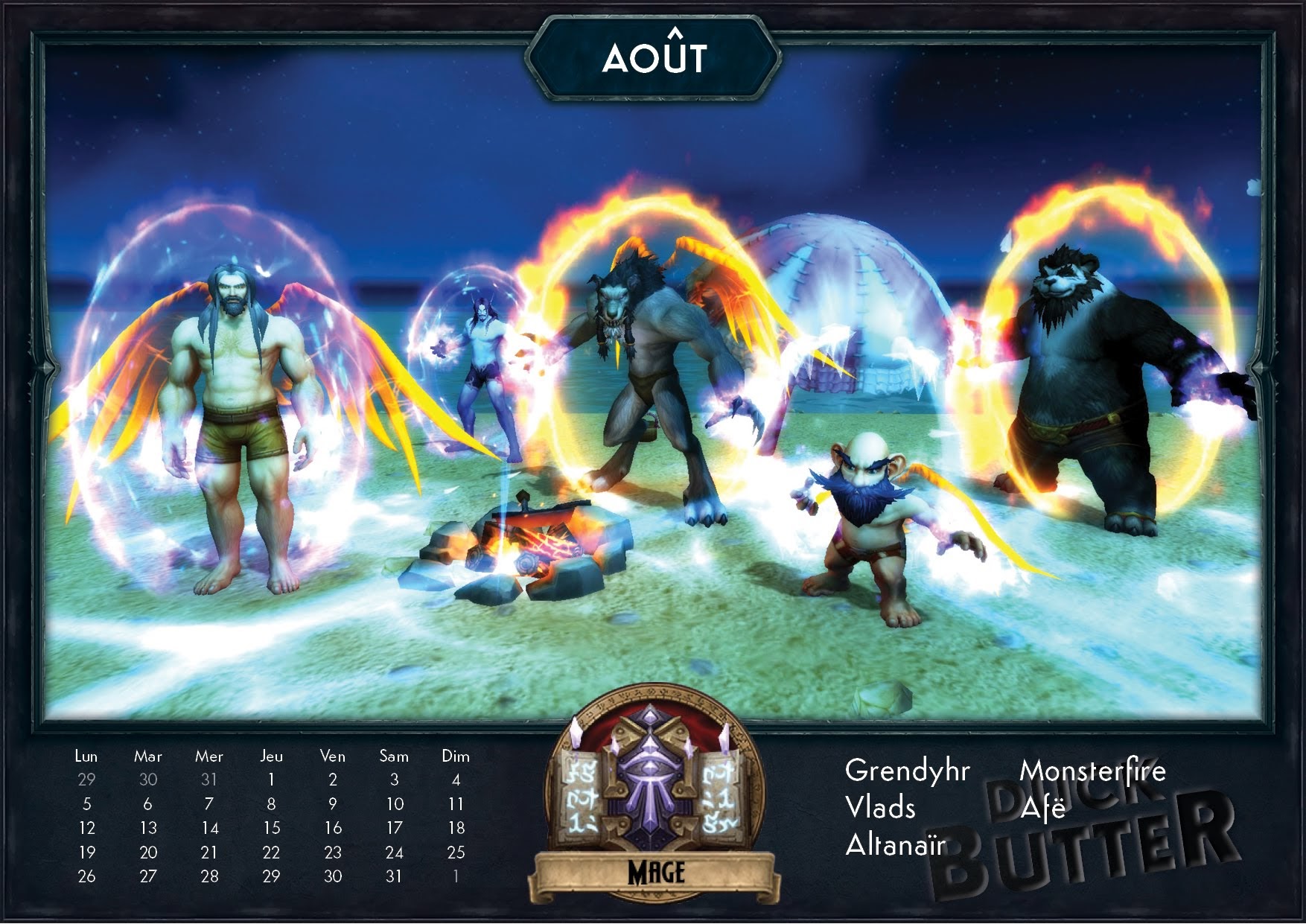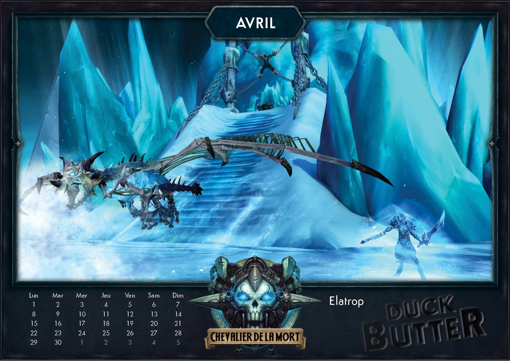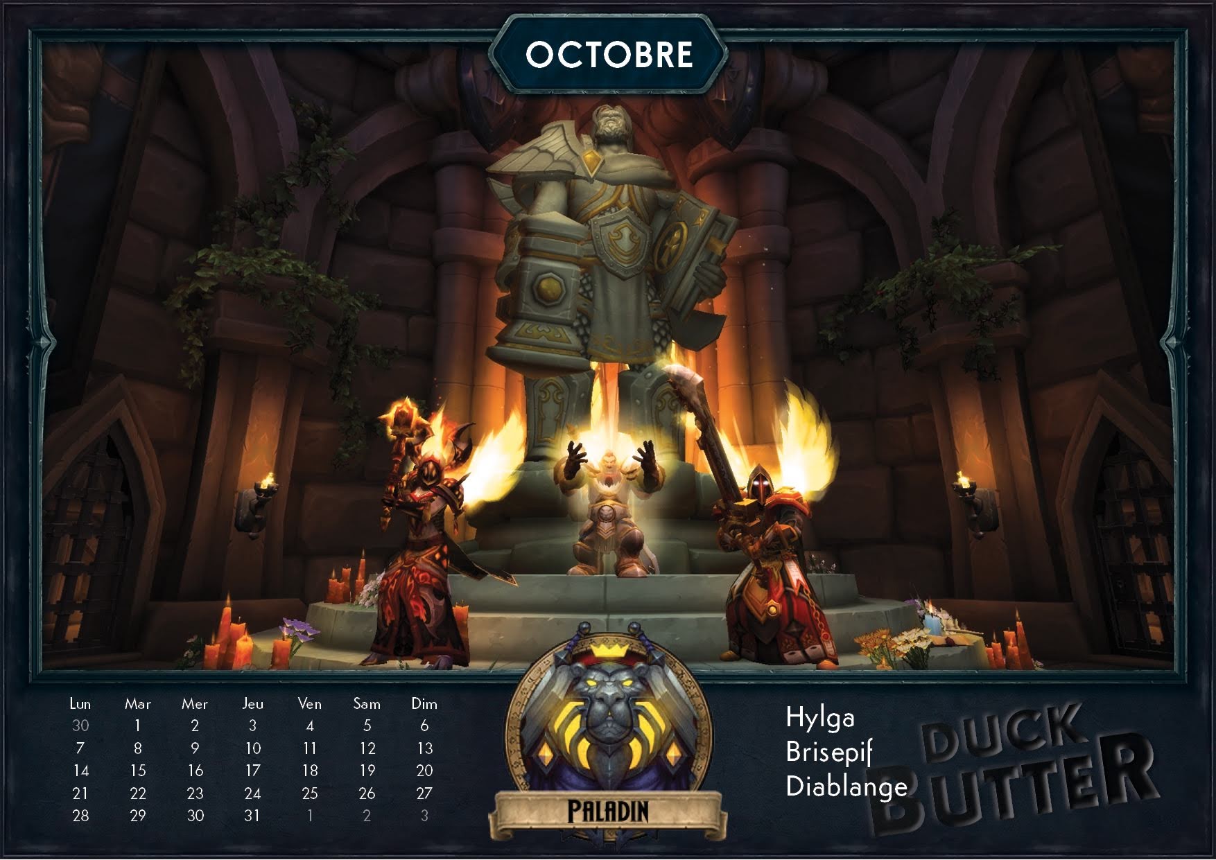 Cahouet et Ganotron de la guilde Duck Butter sur le serveur Rashgarroth m'ont contacté pour partager l'une de leur création avec la participation de tous leurs membres. Pour attaquer sereinement l'année 2019, vous pouvez retrouver un calendrier thématique avec les 12 classes de World of Warcraft pour chaque mois de l'année. Par des captures d'écran retravaillées pour donner un résultat sympathique, vous serez immédiatement plongé dans le thème de votre classe comme un mois d'avril à la Couronne de glace par les chevaliers de la mort ou un mois d'octobre sur la refonte du tombeau d'Uther par les paladins.