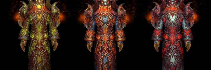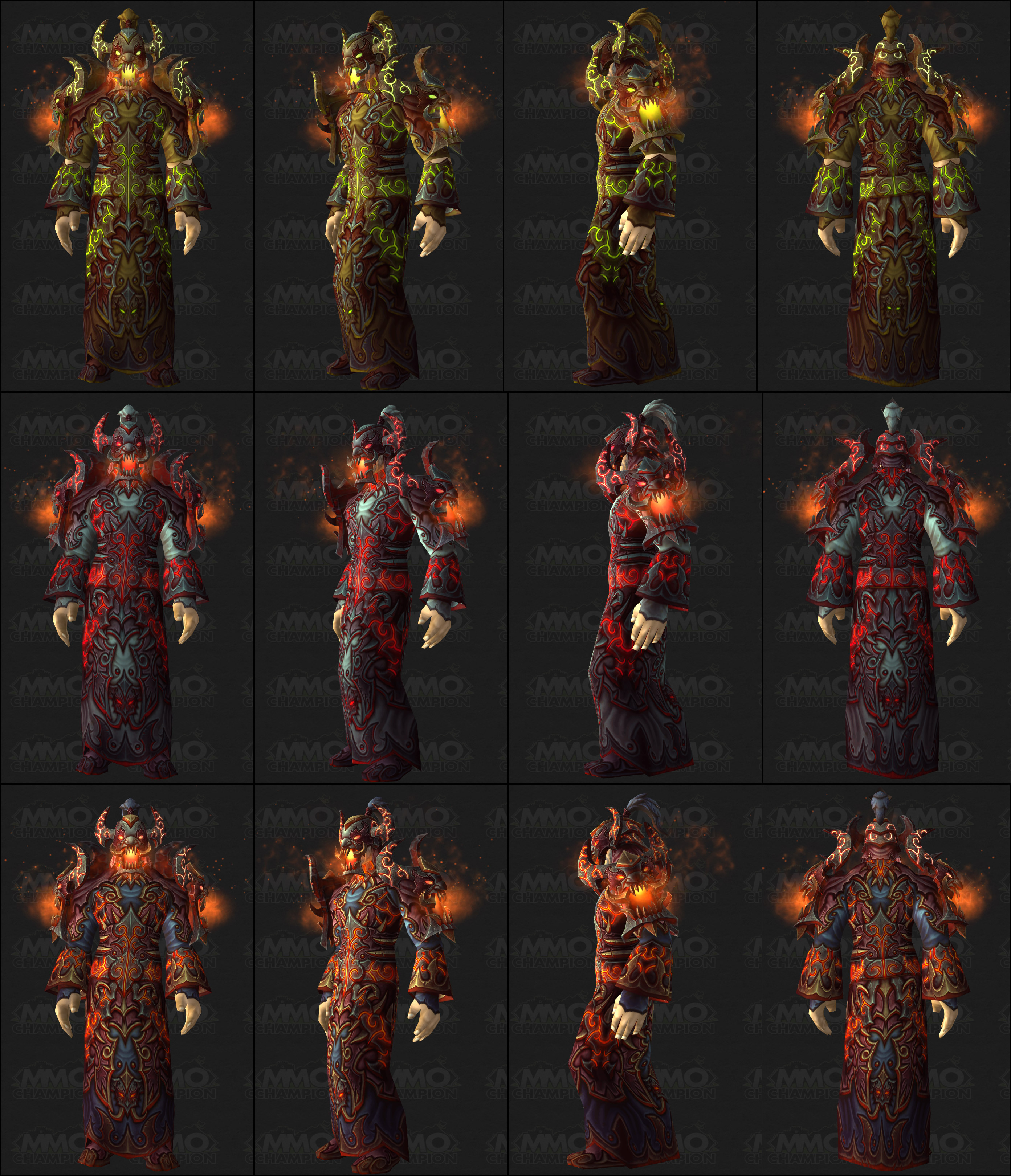 Boubouille de MMO-Champion a pu trouver une nouvelle intéressante car il s'agit du visuel du T15 démoniste grâce au prochain patch 5.2 : la chute du Roi-tonnerre. Il existe en trois couleurs actuellement pour le LFR, mode normal et mode héroïque ayant les couleurs respectives : jaune, rouge et orange. Je ne sais pas vous, mais je trouve qu'il manque d'un coté démoniaque mise à part la tête légèrement particulière.