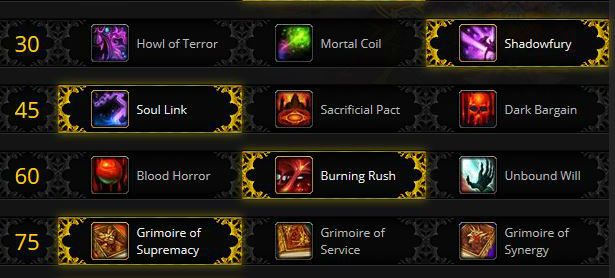 Depuis Mists of Pandaria, le système de talents a été repensé pour n'avoir la possibilité de choisir qu'un talent sur les trois proposés sur une même rangée tous les 15 niveaux. Mais, un bug a été trouvé pour profiter de l'effet de deux talents simultanément mais l'utilisation de bug est interdit par Blizzard. Cette astuce concerne la rangée de niveau 45 avec Lien spirituel, Sombre marché et Pacte sacrificiel mais surtout lié au grimoire de sacrifice. En effet, sacrifiez votre démon avec le grimoire de sacrifice puis changez de talent pour Sombre marché où Pacte sacrificiel pour conserver le bonus de 20% au points de vie.