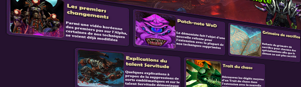 Nous avions mis en place un nouveau menu spécial pour Warlords of Draenor afin de mettre en avant les informations clefs du démoniste tel que le dossier complet, les notes de mise à jour, les talents de niveau 100, l'aperçu du T17, les avantages de Draenor et enfin notre dossier réservé au contenu de l'extension sur BlizzSpirit. Ils seront très prochainement mis à jour pour reprendre les dernières informations de l'extension sur le contenu en général, et plein de nouveaux articles sont à venir également.