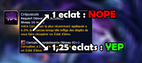 Je vous conseille également de trouver un équilibre afin de rester entre 1 et 2 éclats dans le cas si votre drain d'âme régénère un éclat ET que Crépuscule se déclenche. Toutefois, si vous êtes à 4 éclats au maximum : le "cycle" reprend avec le facteur de 1,25 de régénération.