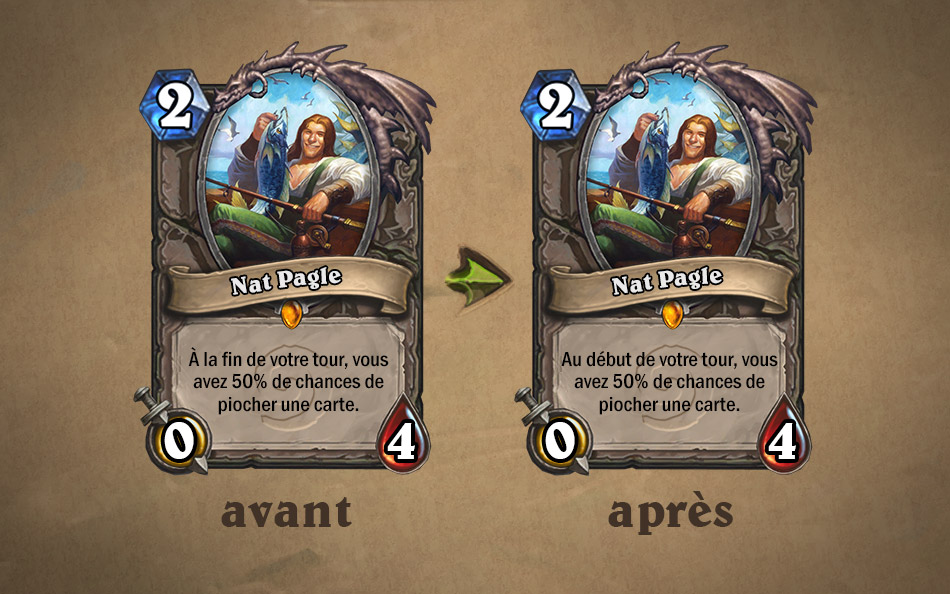 Voici le nouveau descriptif de la carte Nat Pagle : « Au début de votre tour, vous avez 50% de chances de piocher une carte supplémentaire. »
