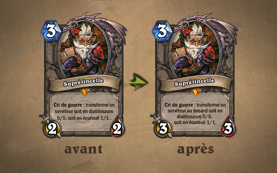 Suprétincelle passe à 3/3 (au lieu de 2/2) et voici son nouveau descriptif : « Cri de guerre : transforme un autre serviteur aléatoire soit en diablosaure 5/5, soit en écureuil 1/1. »