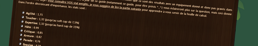 ... Oui, j'ai déjà utilisé cette phrase dans la dernière annonce d'un guide, mais je la trouvais stylée alors je ne me gêne pas pour la remettre (spoiler alert : je risque même de recommencer ^_^)!Aujourd'hui, c'est le guide Ordre de priorité des stats qui vient d'être mis à jour de façon substantielle et que j'ai le plaisir de vous présenter ! Vous y trouverez la priorité des statistiques du Maître-Brasseur, avec des stat weights correspondant à un Moine de niveau 90 en équipement PvE, mais aussi et surtout l'explication pour utiliser le spreadsheet créé par Gothmog (et qu'il a eu la bonté de nous partager sur le fofo officiel et EJ) permettant de déterminer VOS stat weights avec précision !