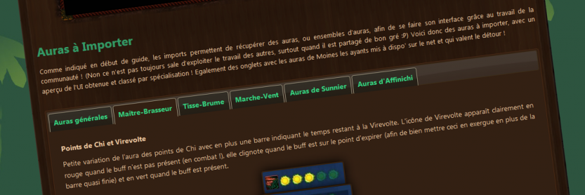 - Et enfin, LA partie intéressante pour la plupart d'entre vous : des auras à importer. Vous y retrouverez des auras générales pour le Moine, des auras spécifiques aux trois rôles de notre classe, des auras de Moine actifs au niveau de la communauté et enfin des auras crées par les visiteurs de Monk Spirit ou par les rédacteurs à leur demande !