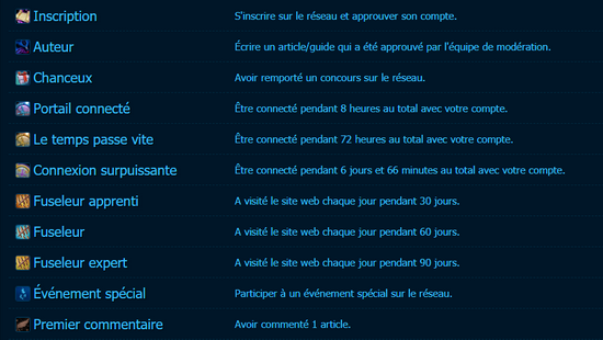 De la même manière que les seuils sur World of Warcraft, vous aurez besoin de 4200 points pour devenir exalté avec différents paliers : Neutre (300), Amical (600), Honoré (1200), Révéré (2100). En complément de ces points de réputation, les hauts-faits vont également permettre d'accomplir des actions avec une liste de 33 hauts-faits que vous pouvez collectionner. Certains doivent passer par une validation manuelle par l'administrateur mais la plupart peuvent être obtenus dynamiquement ! Amusez-vous à tous les collectionner pour compléter votre profil.