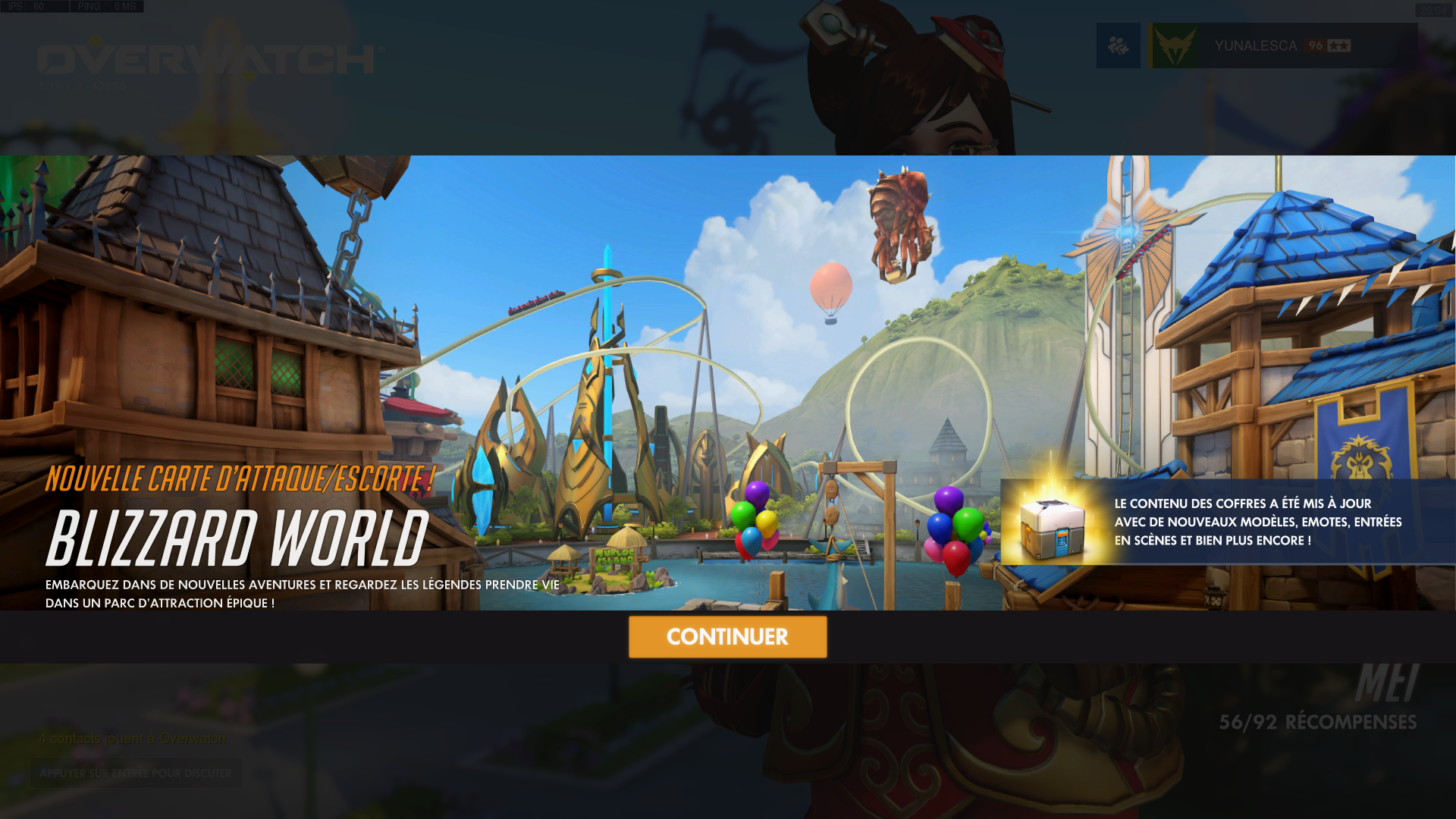 La mise à jour 1.19.1.3.42936 d'Overwatch est l'une des plus importantes sur le contenu déployé dès le mardi 23 janvier, 20h00 (heure de Paris) puisque celle-ci permet d'ouvrir les portes du célèbre parc d'attraction « Blizzard World », une nouvelle carte de type hybride avec des clins d'oeils sur les autres licences de Blizzard. De plus, les coffres de butin classique proposent également jusqu'à 100 nouveaux objets cosmétiques avec 5 modèles épiques, 12 modèles légendaires, 4 entrées en scène, 5 émotes, des répliques ainsi que des tags et portraits de héros.