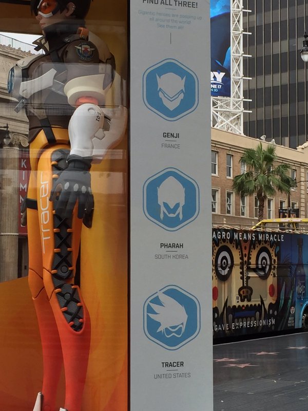 Le 19 mai 2016 un mystérieux tweet publié par Overwatch comprenant un .gif, avec 3 villes et des heures a semé le doute dans l'esprit des fans. Un nouveau héros ? Une sortie avancée pour les précommandes ? Que nenni! Hier, vendredi 20 mai, nous avons eu la réponse à cette interrogation. Dans trois grandes villes du monde : Hollywood, Paris et Busan ont étés installés et montés des figurines géantes représentant trois des héros de Overwatch. A Hollywood, c'est Tracer qui fait sa star, a Paris, c'est Genji qui a fait le voyage avec son katana, et à Busan c'est Pharah et ses roquettes qui ont fait le déplacement.