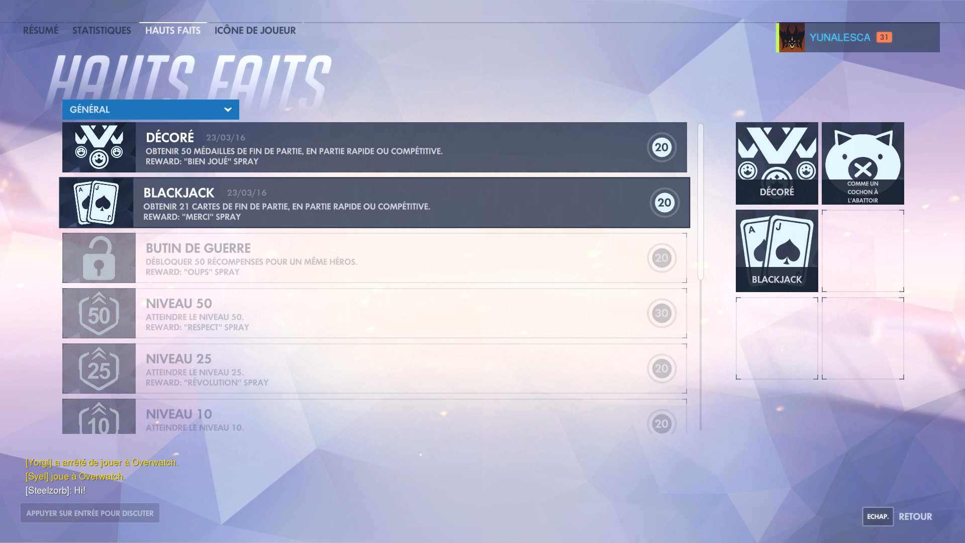 Les hauts-faits généraux pour Overwatch concernent principalement la progression du compte en niveau, vos performances comme réaliser une série de victimes ou se retrouver dans les cartes de fin de partie, ou même des actions bénéfiques au cours d'une partie qui ne peuvent pas être classées dans les héros.