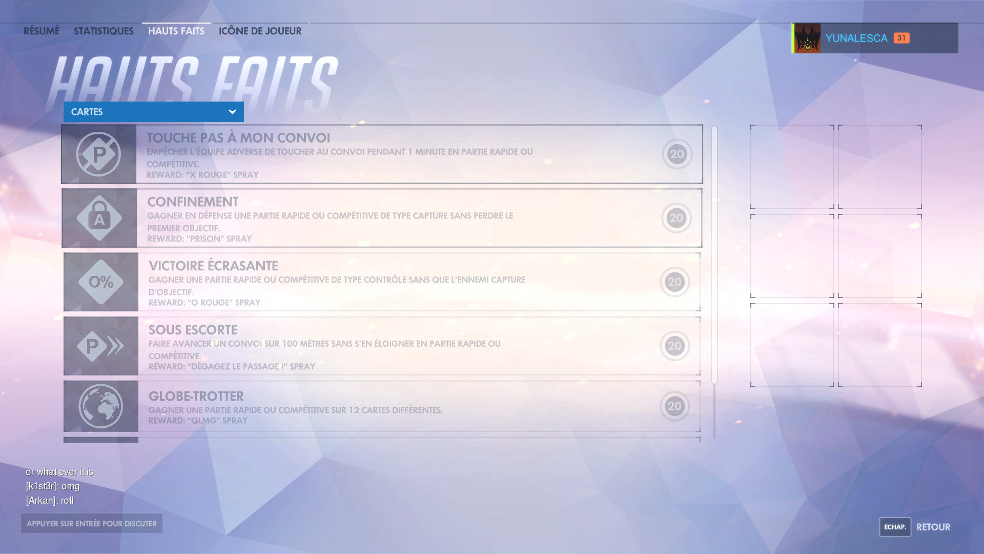- Cartes : concerne les hauts-faits liés aux objectifs des cartes.