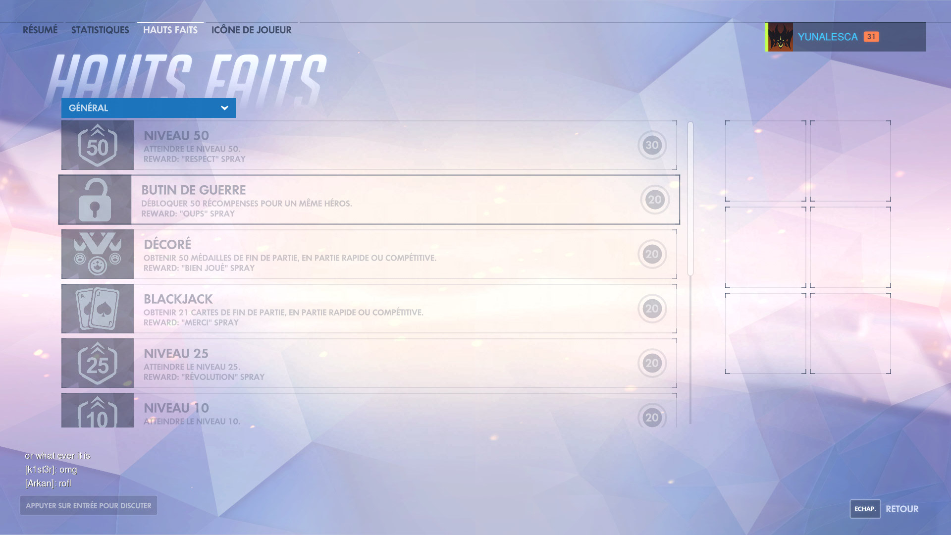 - Général : concerne les hauts-faits liés à la progression du compte.