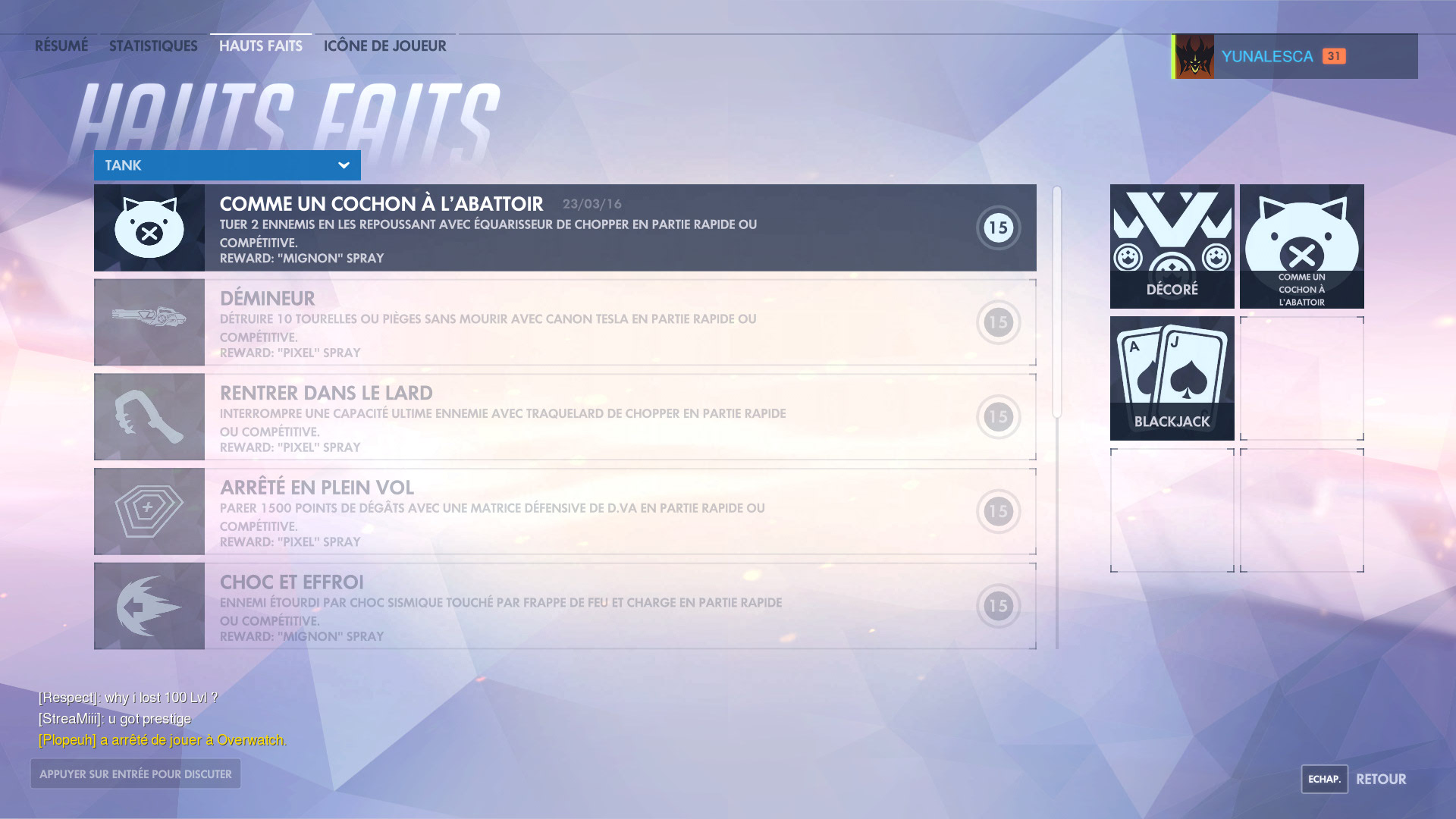 Les hauts-faits de type Tank pour Overwatch concernent les héros de ce même rôle avec Chopper, D.Va, Reinhardt, Winston et Zarya. Ces hauts-faits vous récompensent de 15 points avec un spray de modèle "Pixel" et "Mignon" selon le haut-fait réalisé au nombre de deux par héros.