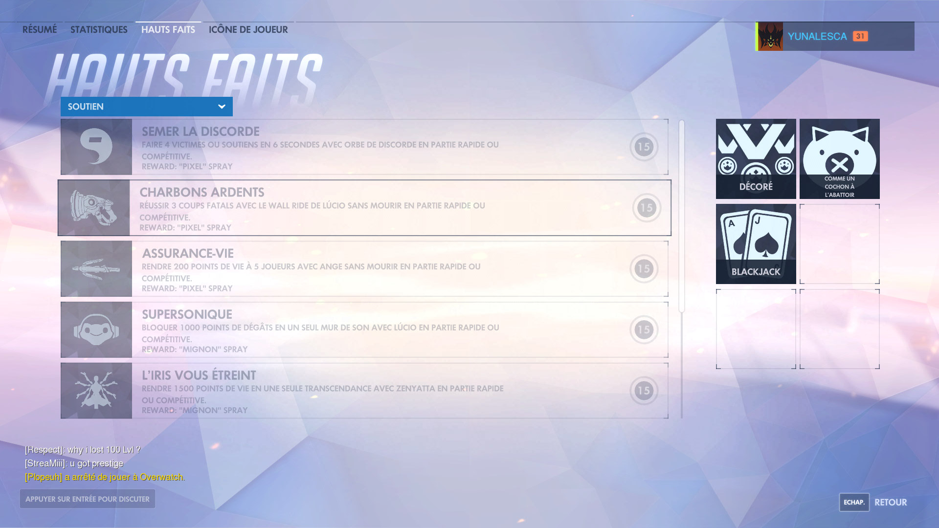 Les hauts-faits de type Soutien pour Overwatch concernent les héros de ce même rôle avec Ange, Lucio, Symmetra et Zenyatta. Ces hauts-faits vous récompensent de 15 points avec un spray de modèle "Pixel" et "Mignon" selon le haut-fait réalisé au nombre de deux par héros.
