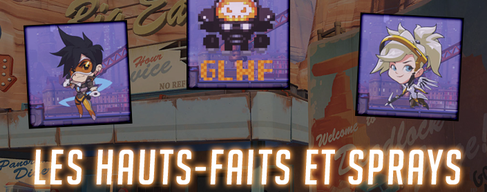 Une fois réalisé, vous obtenez une récompense avec 15 à 20 points de hauts-faits mais également un spray qui permet de décorer les murs du monde d'Overwatch que vous pouvez retrouver dans les parties suivantes, mais en voici un aperçu :