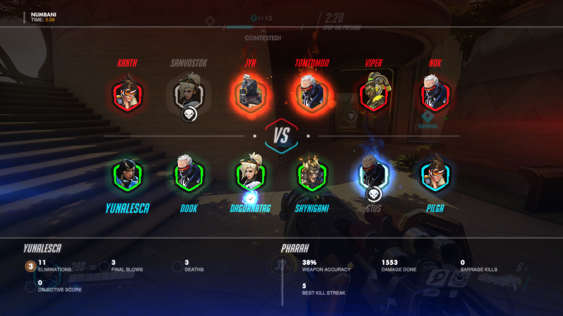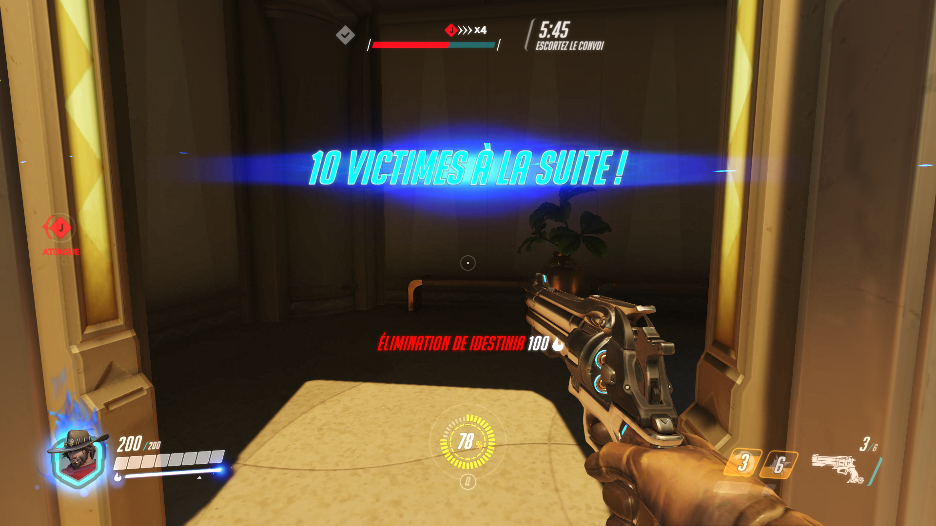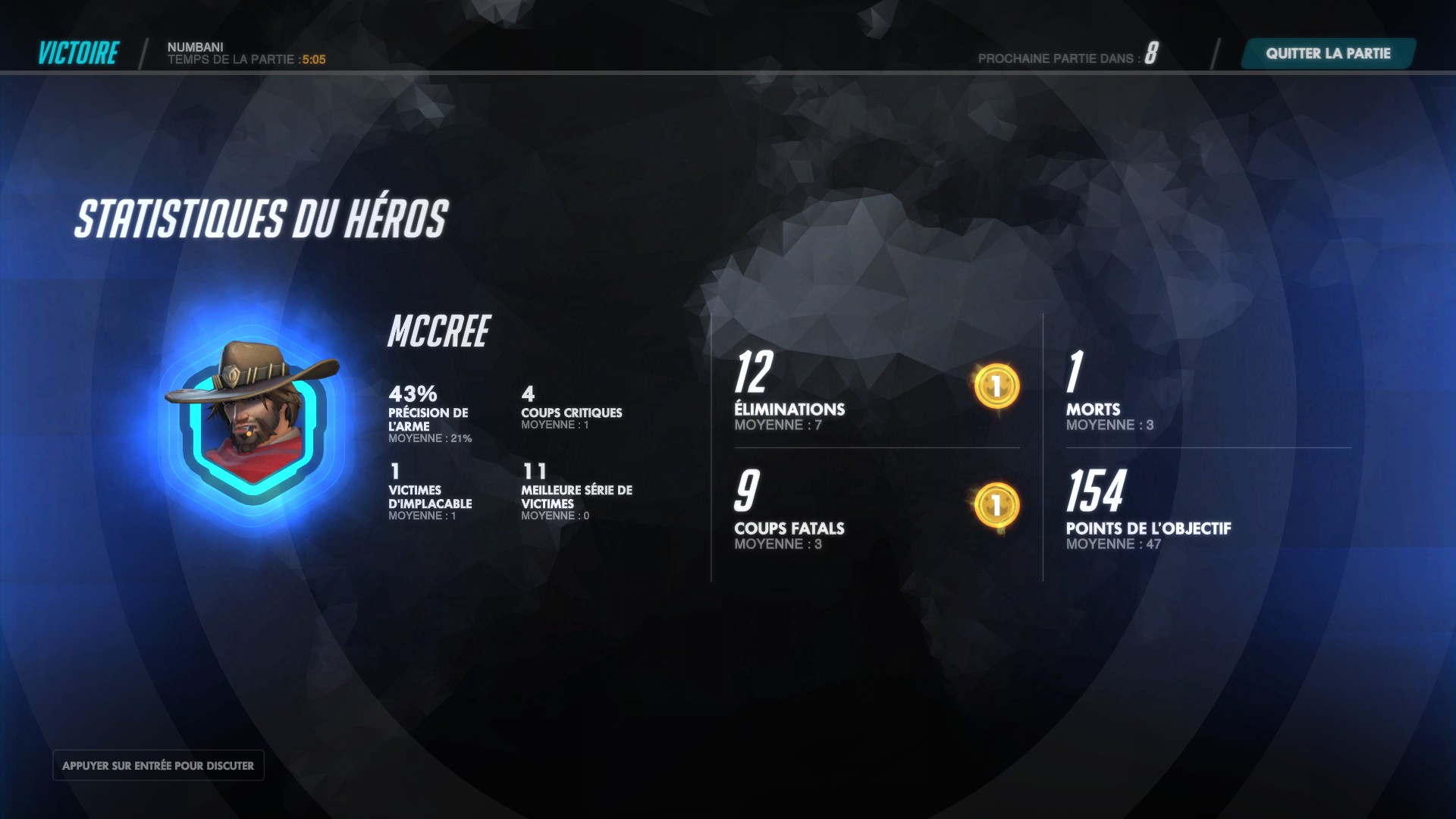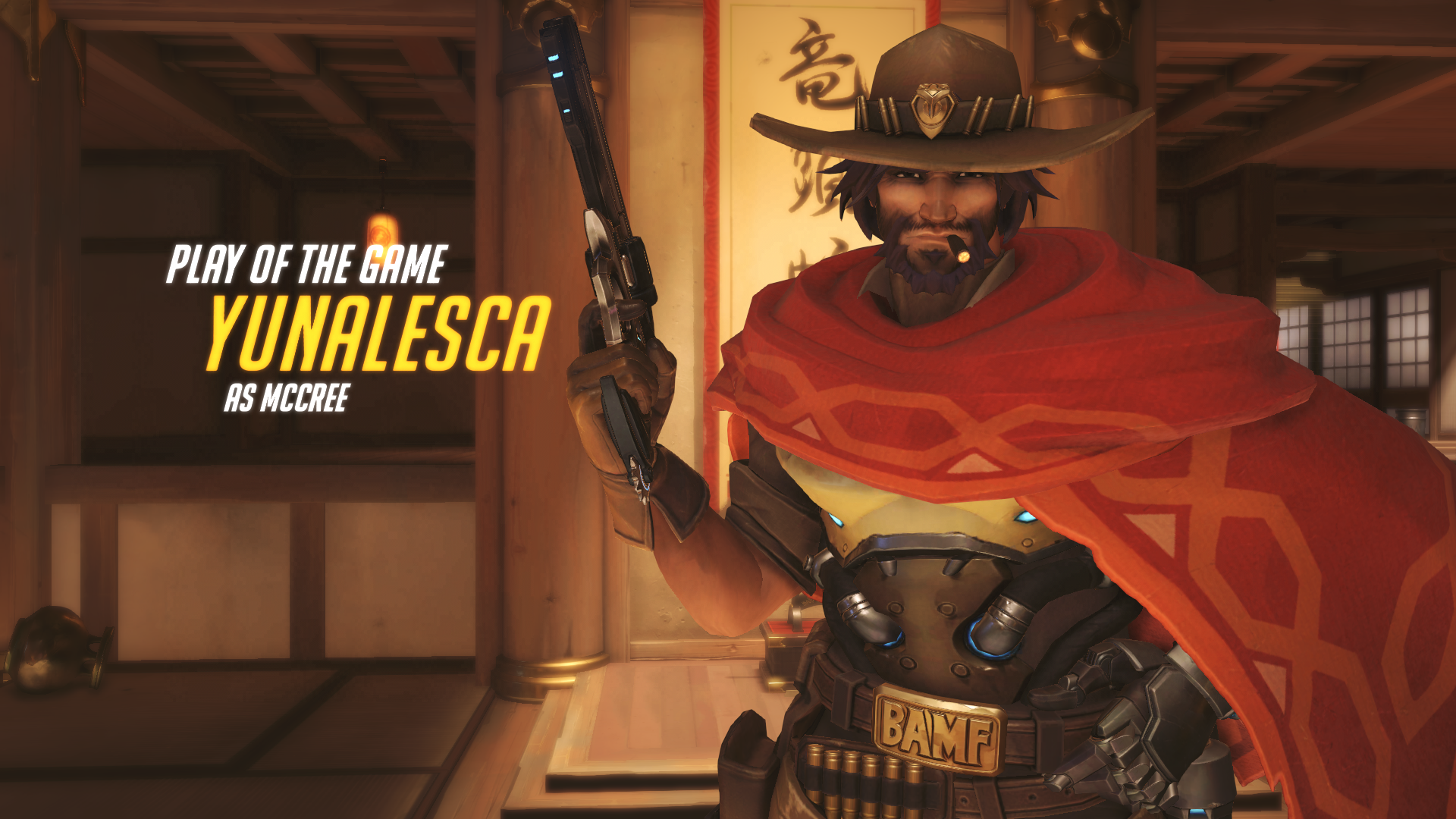 Yünalescä : J'avais un peu d'appréhension à jouer McCree car je pensais qu'il fallait être extrêmement précis pour jouer ce héros, mais finalement, c'est le contraire : son pacificateur n'a que 6 munitions mais inflige de lourds dégâts de précision surtout à l'activation du barillet (clic-droit) mais honnêtement, c'est très difficile à utiliser : pendant son utilisation, le viseur remonte en l'air et c'est assez frustrant de ne pas avoir une meilleure liberté de viser, je pense qu'il faut prendre le coup de main à viser par terre puis laisser faire les choses. Son ultime est très difficile à utiliser également, il faut vraiment être protégé par un Reinhardt ou Winston pour prendre le temps de faire un multi head-shot en 10 s. Sinon le bilan est très sympa surtout qu'il m'a valu la "MEILLEURE ACTION DE LA PARTIE !" avec un Penta-kill sur une attaque.
