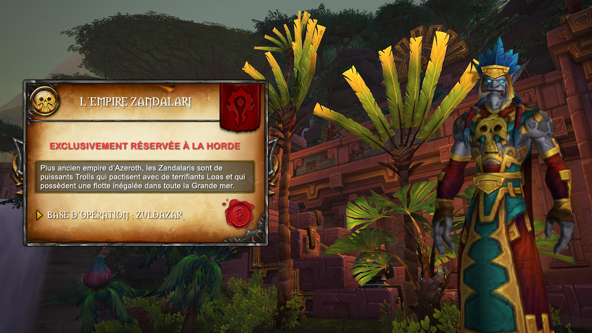 L'empire zandalari est l'une des quatre factions réservée à la Horde sur Zandalar dans Battle for Azeroth. Découvrez toutes les informations concernant cette réputation avec une base d'opération dans la région de Zuldazar avec notre guide complet afin d'obtenir plusieurs récompenses uniques comme une monture pterreurdactyle, des variations aux sorts ou recettes de métiers au rang 3.