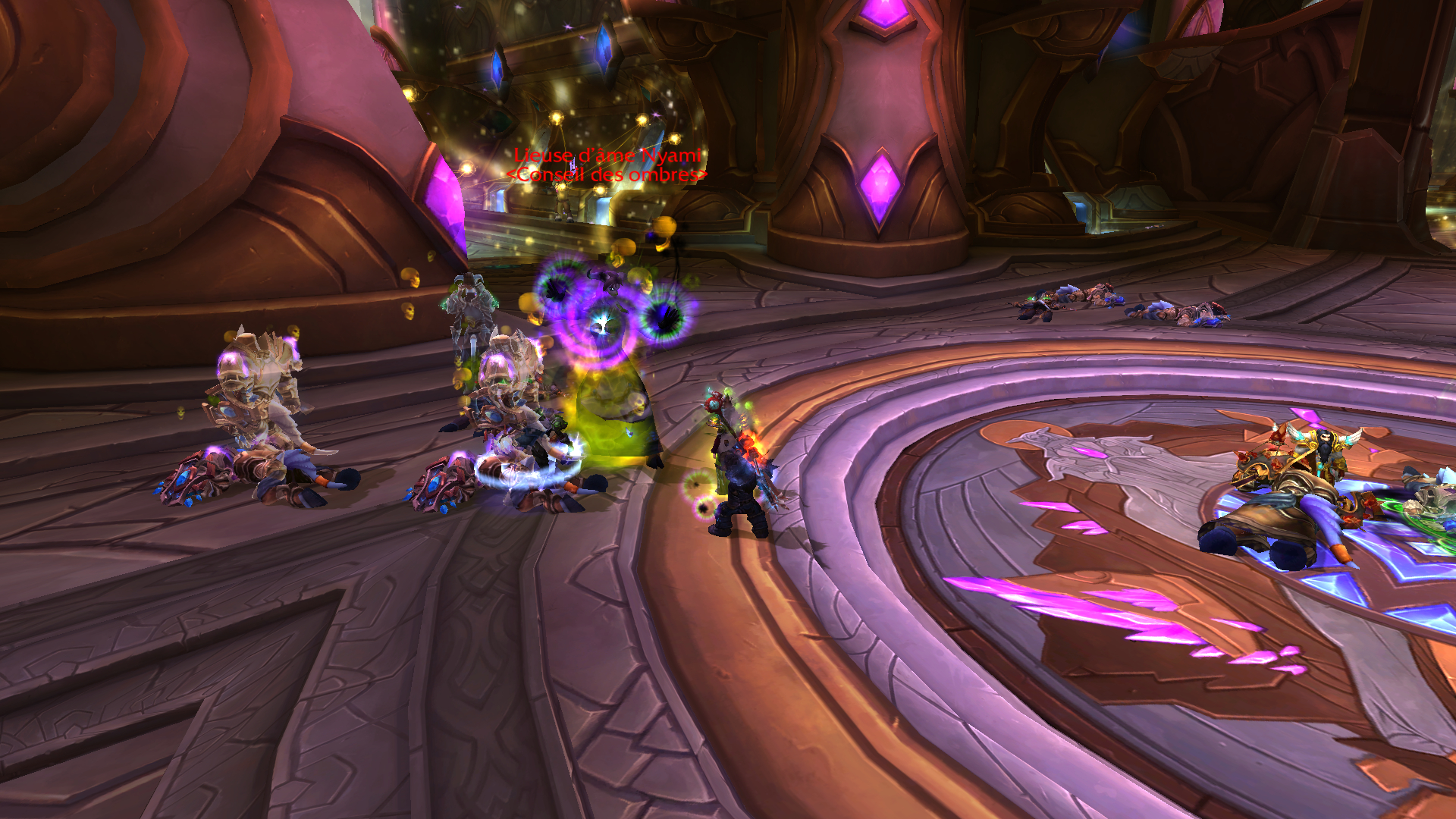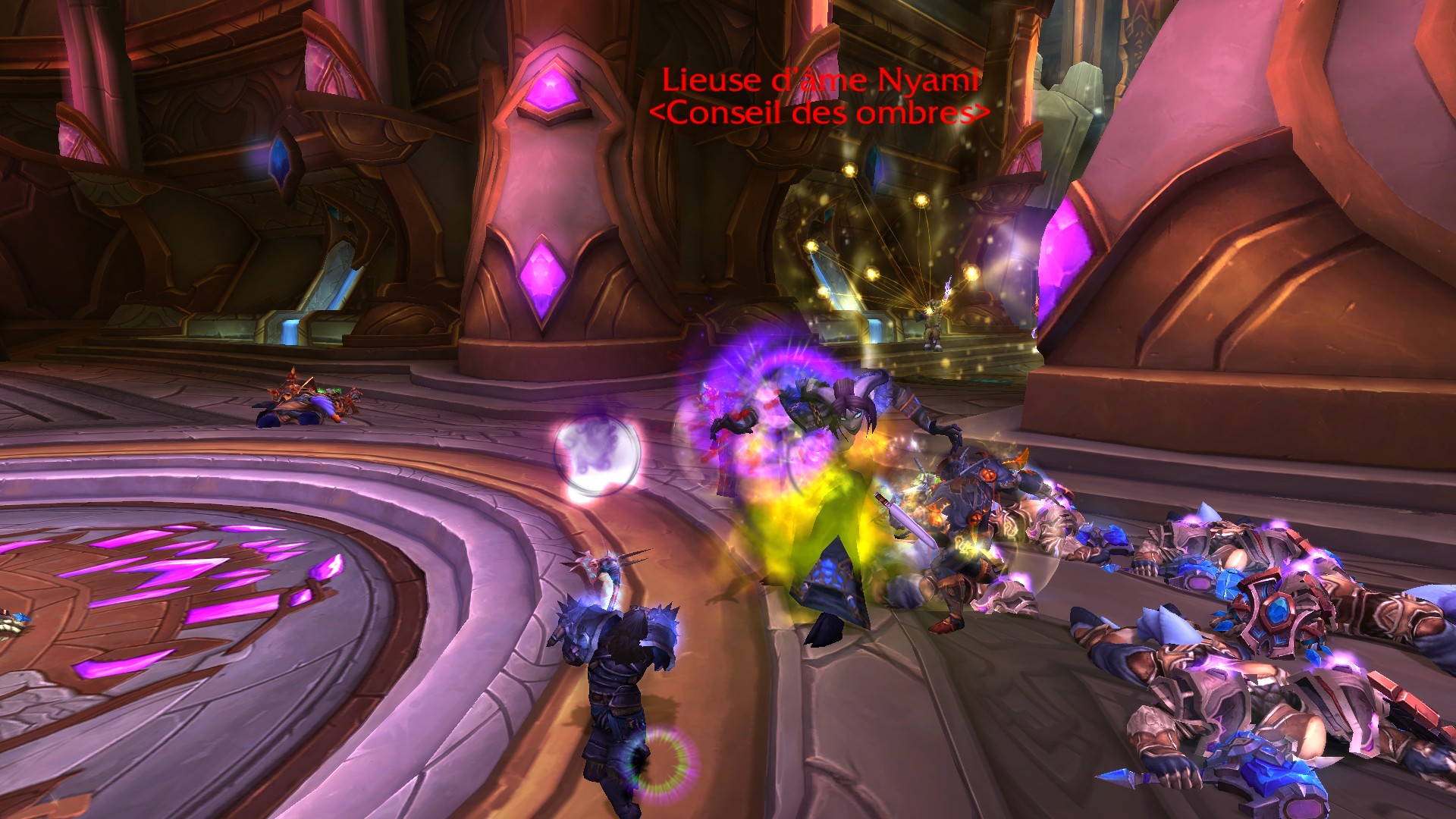 Réceptacle d'âme à un emplacement aléatoire dans la salle ayant pour aspect d'une bulle protectrice marquée d'une flèche bleue au-dessus. Vous n'aurez quelques secondes pour vous rendre à l'intérieur sous peine de subir de nombreuses pulsations de dégâts d'ombre sur l'ensemble du groupe. Tentez au maximum de vous tenir dans ce réceptacle où utilisez un temps de recharge défensif si vous devez subir quelques "ticks". Et pour terminer, Nyami doit être interrompue le plus souvent possible de sa technique