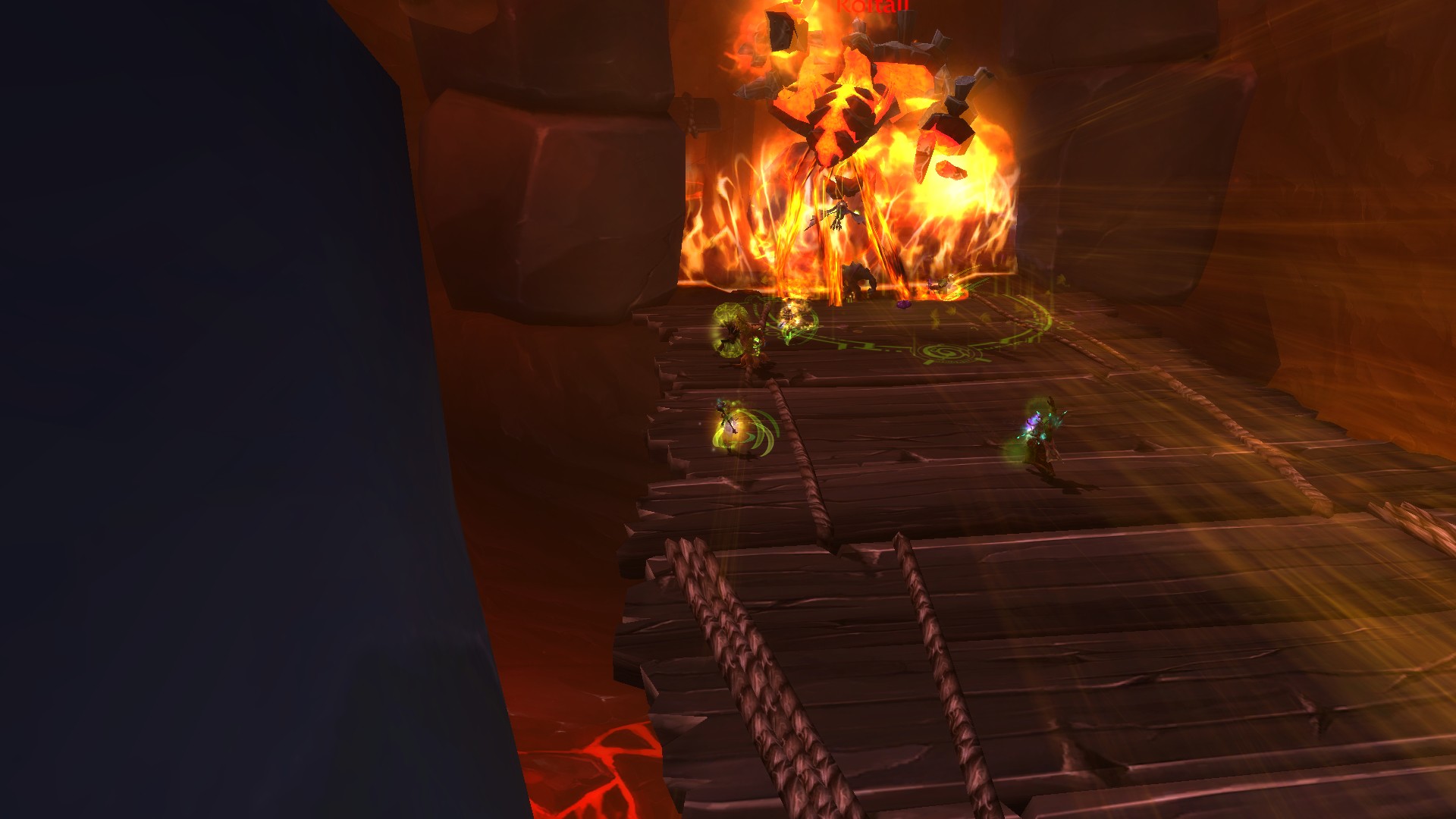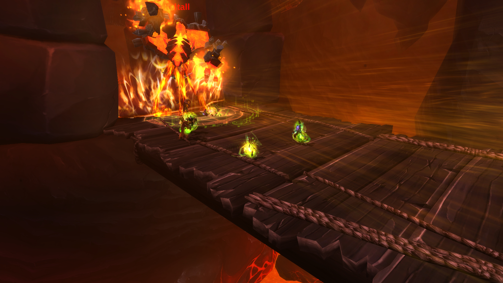 Rocher embrasé indiqué par une zone orange et commençant par la gauche du boss, puis au milieu et enfin à droite. A l'impact, le rocher inflige un montant élevé de dégâts et devront être évités par vos mêlées et tank. Ces rochers traversent lentement sur une ligne droite du pont et devront être esquivés par vos distances et soigneur de préférence même si la quantité de dégâts subis est globalement faible. La complexité du combat est qu'en mode héroïque et défi, les trois rochers reviennent par le même chemin vers Roltall : une danse devra être effectuée pour éviter cette série de trois rochers.