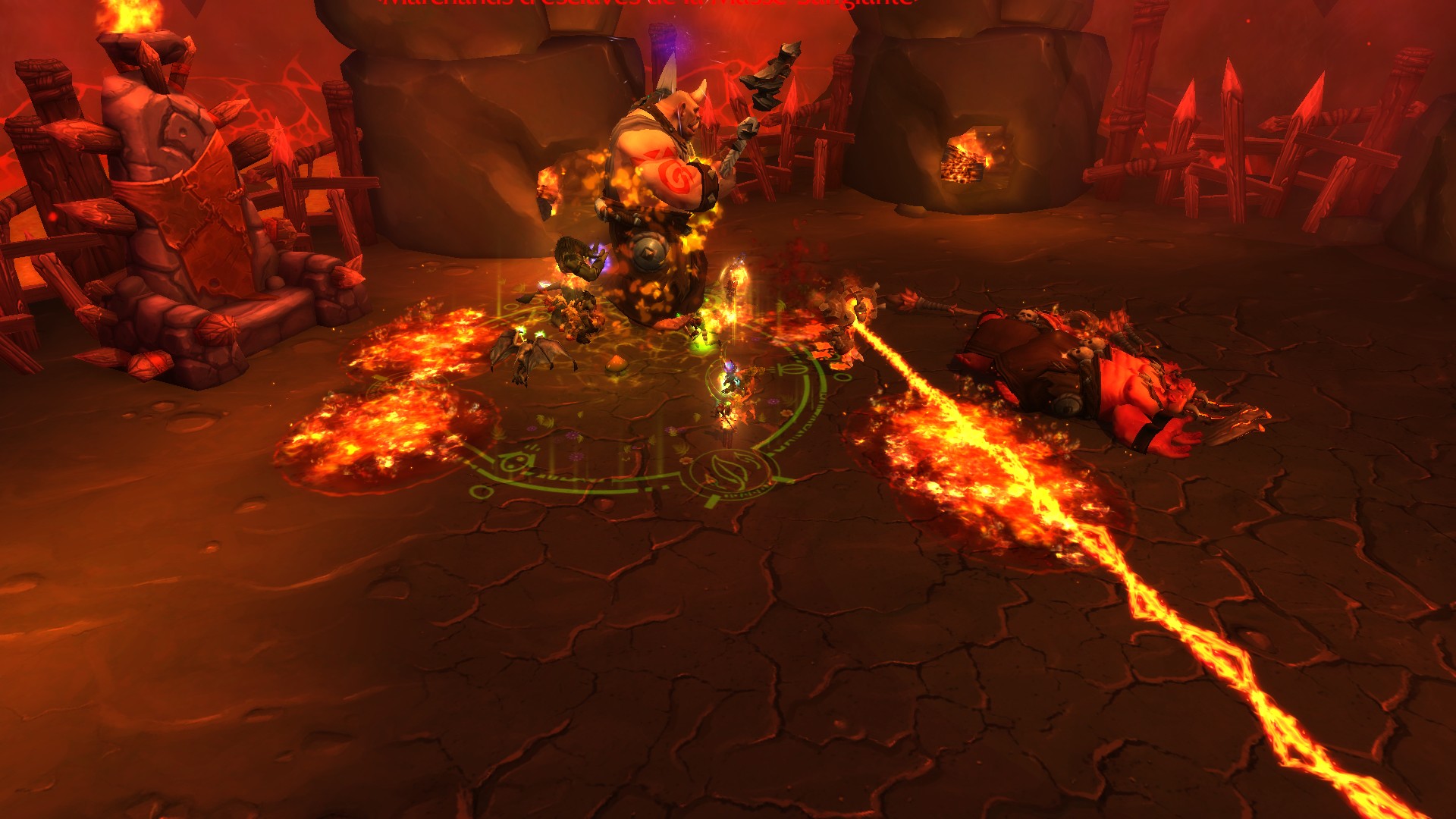 : Gug'rokk met feu à tous les personnages-joueurs, leur infligeant 15 000 | 23 000 points de dégâts de Feu et augmentant les dégâts de Feu qu'ils subissent 5% pendant 20 sec.