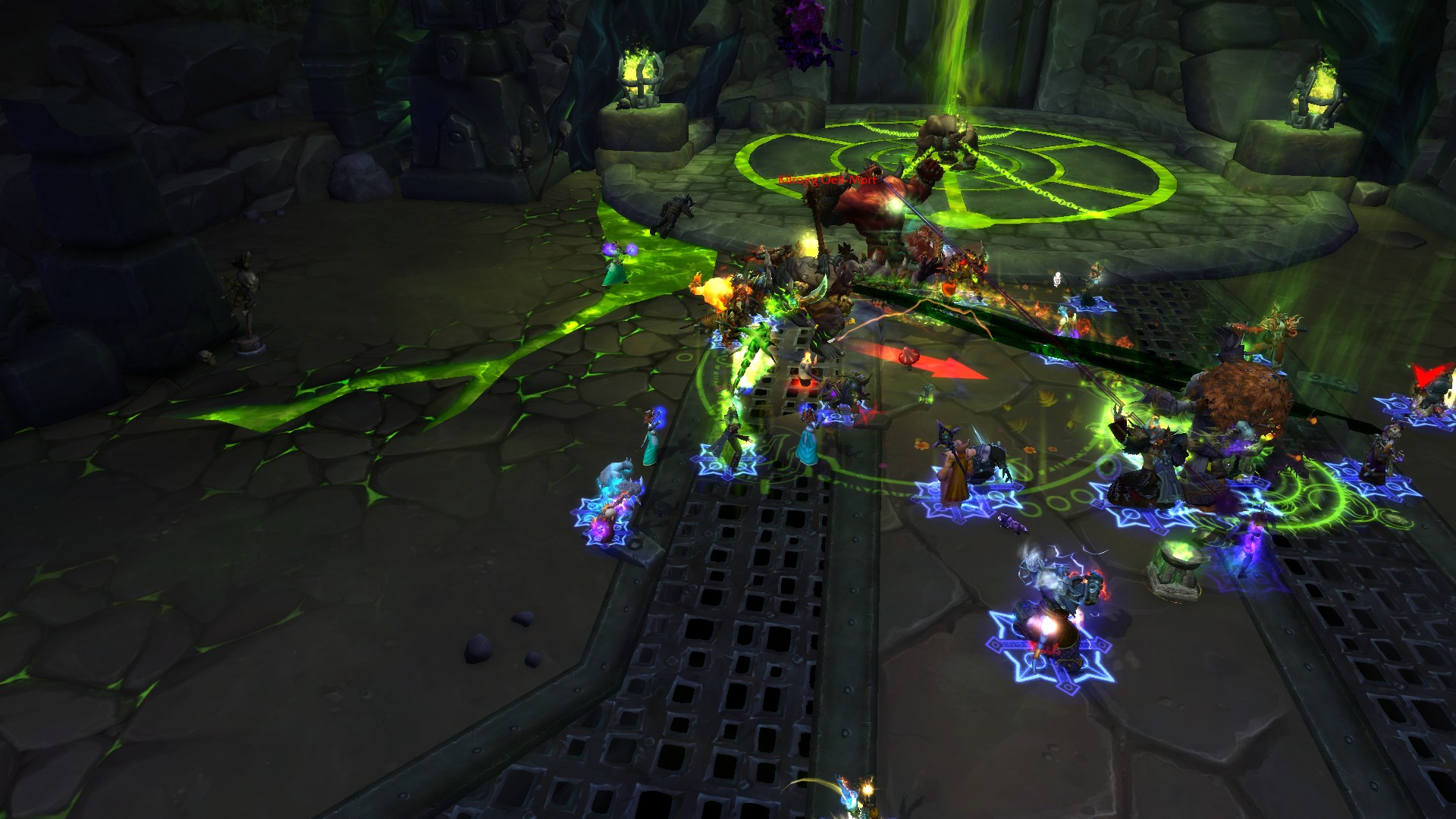 Affres de l'agonie. Pour ceci, nous conseillons d'établir deux groupes distances/soigneurs constitués équitablement et répartis à gauche et à droite de la salle au maximum de portée du boss. Les mêlées/tanks seront vers le bassin de gangresang au milieu de la salle dont les mêlées frappent à gauche/droite en restant relativement à portée de vos soigneurs. Ce positionnement permet de laisser un corridor sain et sauf au milieu pour la gestion du