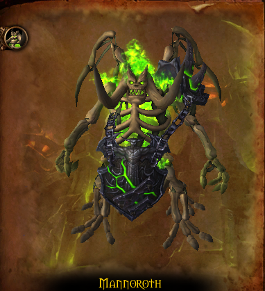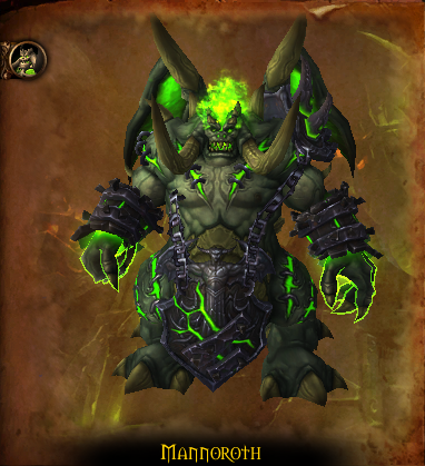 Assoiffé de sang et extrêmement brutal, Mannoroth était l'exécuteur le plus craint parmi les lieutenants d'Archimonde, jusqu'à ce qu'il soit abattu d'un puissant coup de lame par Grommash. Après sa mort, son sang permit à Gul'dan de conclure un accord avec la Horde de Fer et ses alliés. Gul'dan et ses serviteurs tentent désormais de ranimer la dépouille brisée de Mannoroth, après qu'il serve de nouveau la Légion.