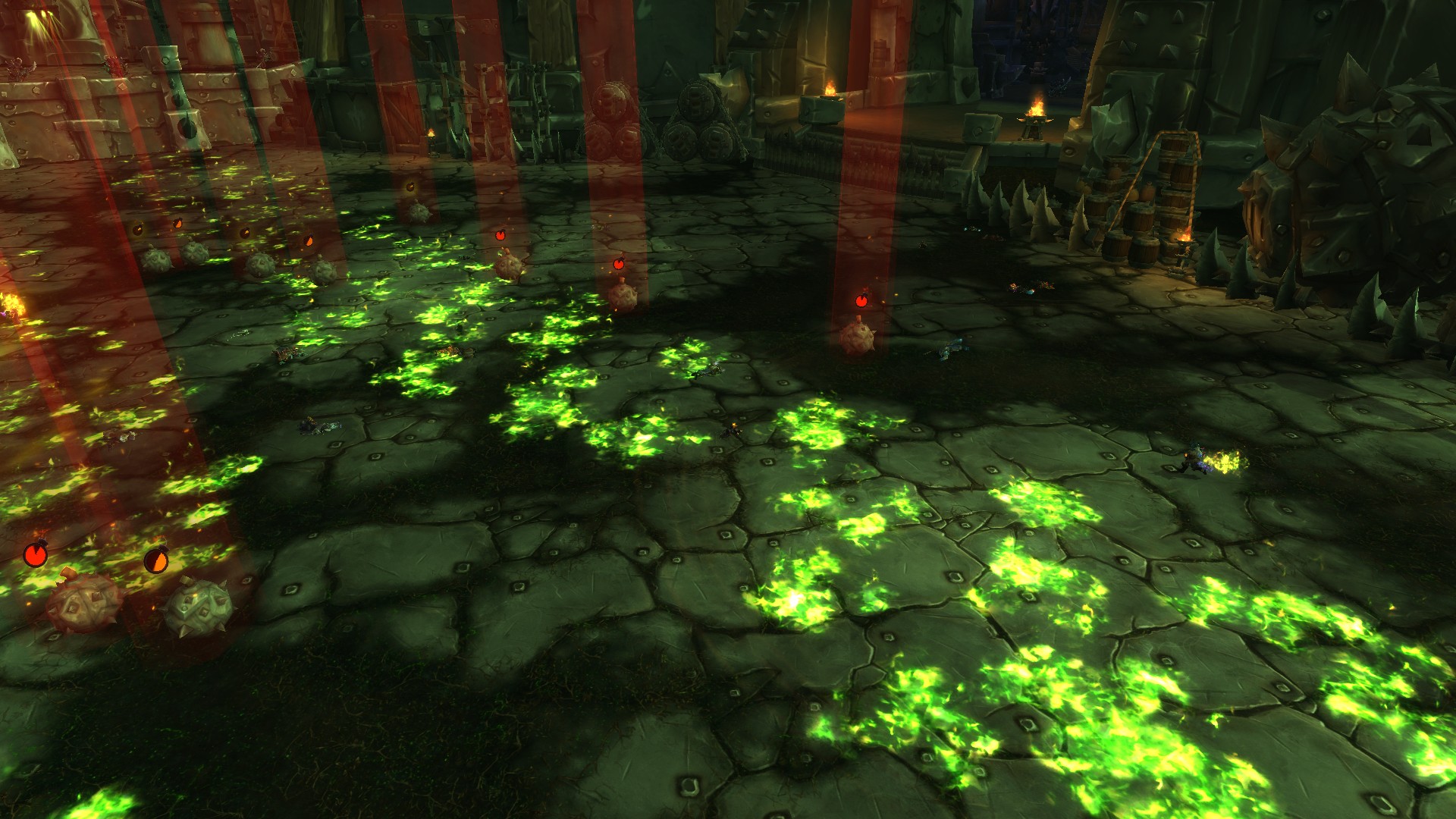 Immoler sont formées au sol dont vous devrez également éviter de traverser à cause du dégât périodique cumulable. Néanmoins, si une flaque de flamme vous gêne dans votre évitement du Barrage : traversez les flammes en utilisant évidemment un temps de recharge défensif si vos piles sont à plus de 5 (normal) | 4 (héroïque) pour soulager vos soigneurs.