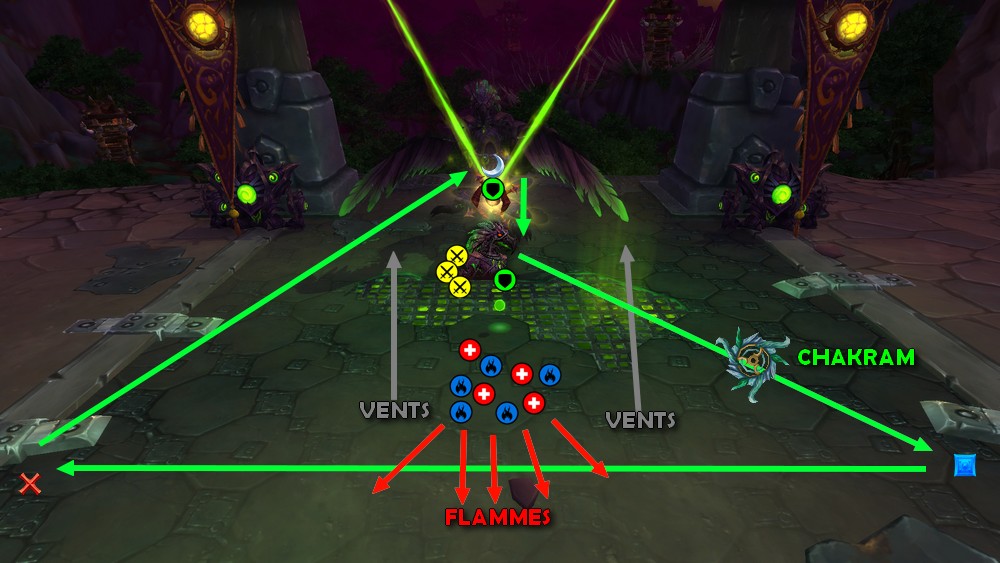 Chakram gangrené pour la première phase. Si le positionnement en triangle de notre schéma dans la partie stratégie n'est pas fonctionnel, il est également possible de former une ligne droite sur l'un des cotés mais vous pouvez également subir deux aller/retours pouvant être compliqué. Placez des marqueurs de couleurs pour vous rendre aux points sélectionnés.