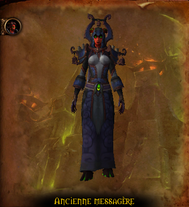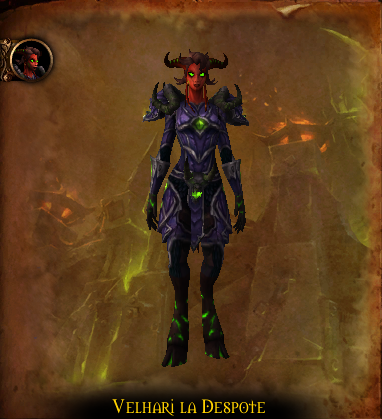 Quand Gul'dan est allé faire son don aux Sargereï, Velhari, qui ne cachait déjà plus ses ambitions, avait gravi les échelons par la force brutale. Surnommée la Despote par ses ennemis, Velhari a été parmi les premiers à accepter le toucher gangrené, ce qui l'a rendue plus puissante encore. A présent, elle porte une parodie du symbole sacré naaru, qui témoigne de son attachement au nouvel ordre.