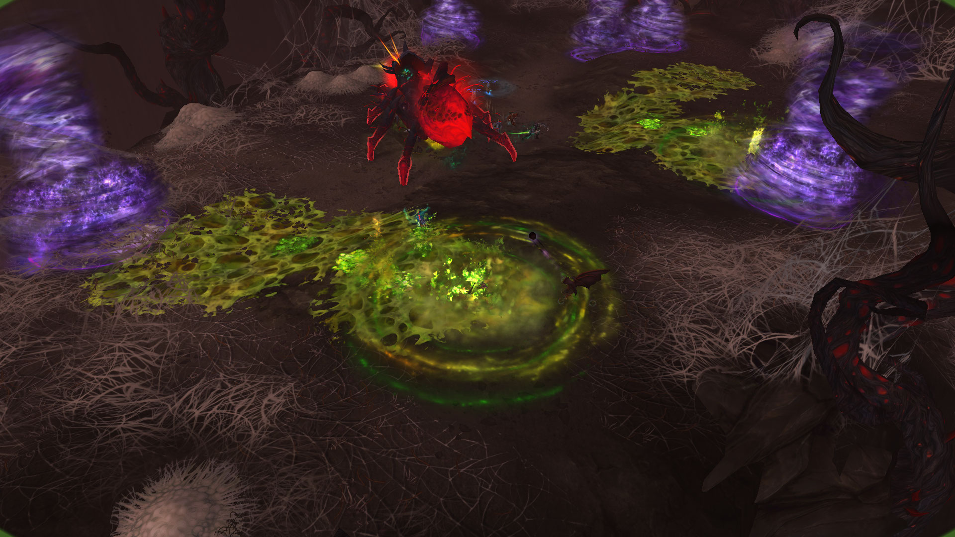 : Recouvre rapidement le sol d'une toile collante. Si des ennemis restent dessus pendant plus de 2 s d'affilée, cela appelle de nouvelles jeunes araignées venimeuses. La toile dure 1,3 min.