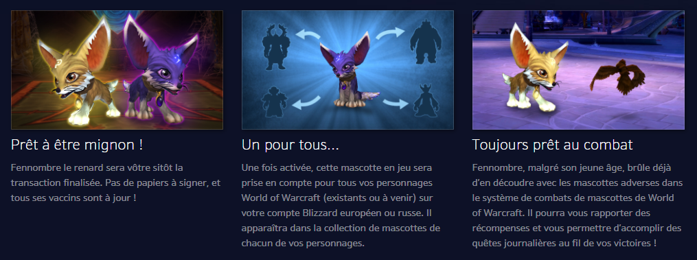 Nous vous présentons la toute dernière mascotte de World of Warcraft qui attend d’être adoptée dans la boutique en jeu et le magasin Blizzard : un astucieux petit renard nommé Fennombre ! Ce rusé compagnon saura se frayer un chemin entre ombre et lumière jusqu’à votre cœur et votre foyer.