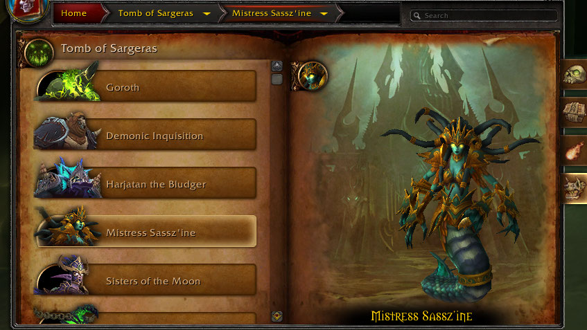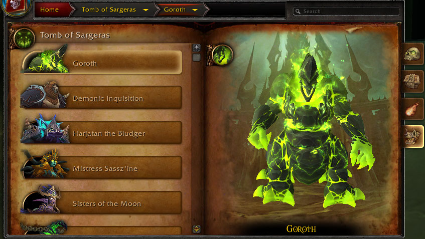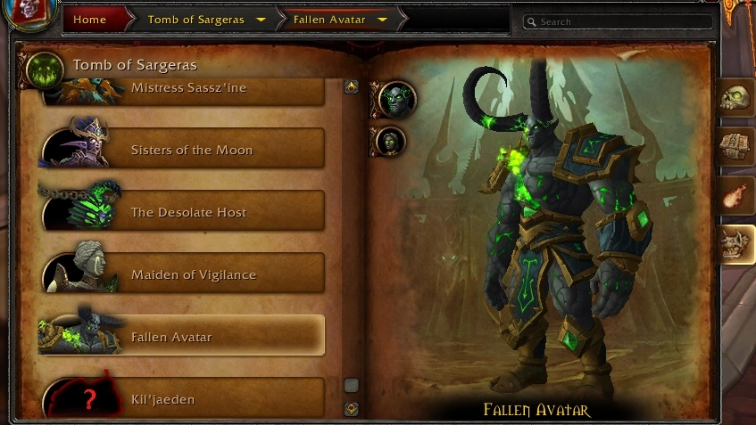 Un nouveau raid à la Tombe de Sargeras localisé au Rivage brisé est composé de 9 boss pour descendre dans les profondeurs d'un ancien Temple d'Elune après avoir arraché l'œil d'Aman'thul à Gul'dan au Palais Sacrenuit. Les cinq piliers réunis vous permettront de sceller le portail de la Légion pour entrer en Azeroth. Plusieurs modèles sont uniques au cours du raid et notamment avec Kil'jaeden en boss final pour le raid et quelques serviteurs de la reine Azshara avec Goroth, Inquisition démoniaque, Harjatan, Sassz'ine, Sœurs de la lune, The Desolate Host, Dame de la vigilance, Avatar déchu et Kil'jaeden :