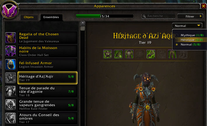L'interface des apparences de Legion est améliorée pour cette mise à jour 7.2 puisqu'il dissocie désormais tous les ensembles d'armures JcJ et JcE relatifs à la classe avec un filtre pour trier la difficulté de chacune des pièces (non)obtenues. De nouveaux hauts-faits seront également disponibles pour collectionner des apparences d'ensemble d'armure. Ce nouvel onglet est disponible directement dans les apparences pour recenser les ensembles d'armures avec un champ de recherche et d'une progression générale :