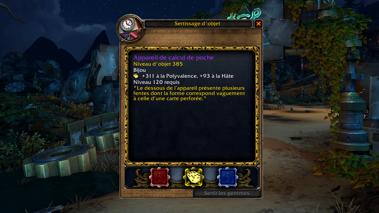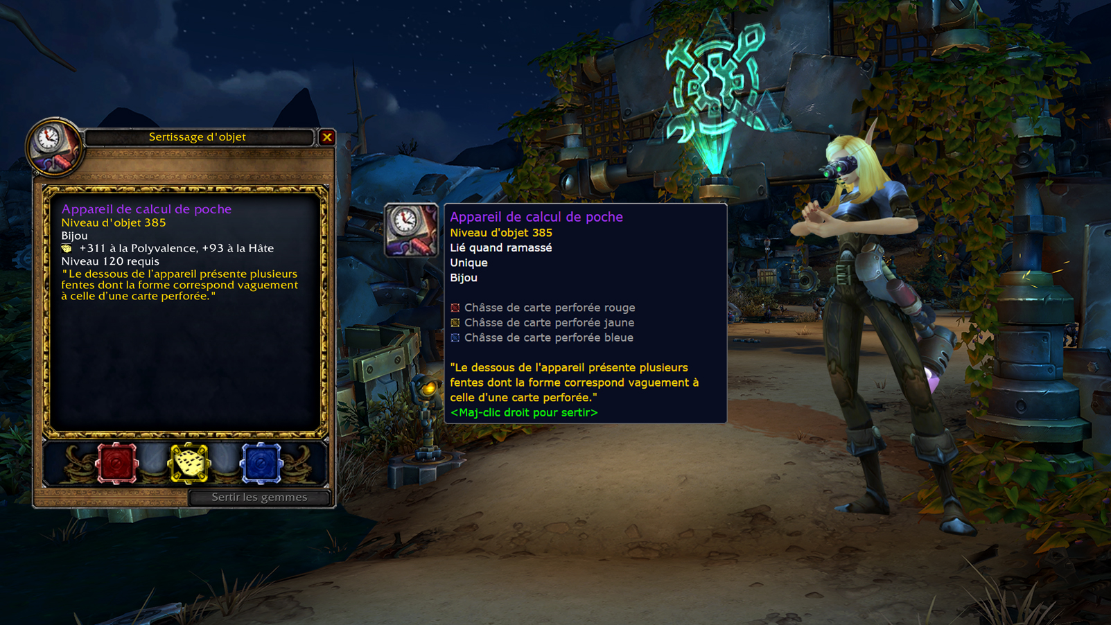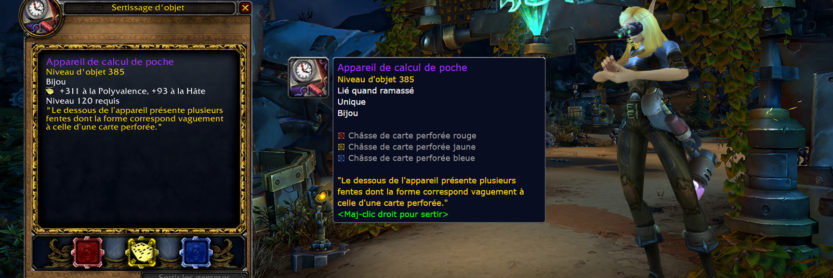 Les gnomes semi-mécanisés de la résistance de Mécarouille mettent tout en œuvre pour aider les nouvelles recrues à Mécagone. Une fois que vous avez terminés les quêtes d'introduction sur l'île de Mécagone à la mise à jour 8.2, une courte suite de quêtes permet d'obtenir le premier bijou personnalisable par l'appareil de calcul de poche. Il est possible de personnaliser avec les trois emplacements de cartes perforées (rouge, jaune et bleue) pour conférer des effets supplémentaires au choix qu'il faudra obtenir via certaines activités. Vous pouvez découvrir toutes les informations concernant cet appareil de calcul de poche et les cartes perforées associées.