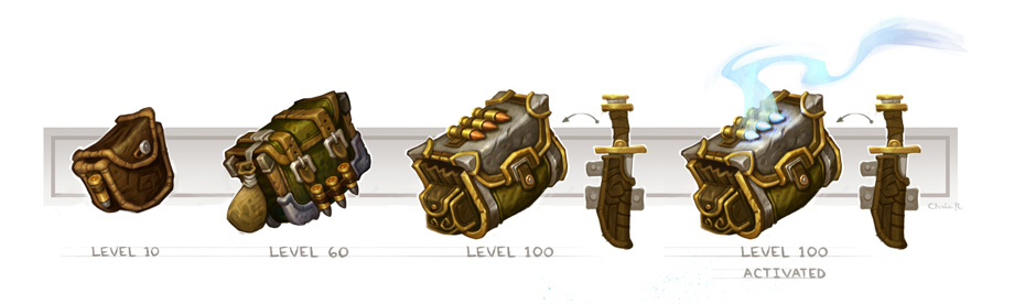 Si l’on trouvait jadis certains de ces objets en jeu dans l’emplacement de relique aujourd’hui disparu, personne ne les voyait jamais sur les personnages. Nous avons récemment réfléchi aux différentes façons de réintroduire dans le jeu ce type de personnalisation visuelle de classe avec des accessoires dont les caractéristiques seraient purement cosmétiques. Et bien qu’ils n’apparaîtront pas en jeu avant quelque temps, nous avons décidé de vous donner un aperçu de nos concepts artistiques préliminaires et avons demandé à Owen Landgren, notre gourou de la conception d’objets, de vous en dire un peu plus sur leur mode de fonctionnement.