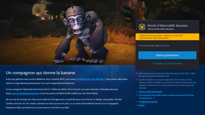 Depuis le lancement du programme de bienfaisance pour l'association caritative Médecins Sans Frontières, le 19 mars 2021, le premier objectif de dons de 500 000 $ a déjà été atteint par la communauté au bout de 6 jours de récolte. Comme promis, vous pouvez désormais obtenir la mascotte singe Bananas gratuitement sur votre compte Blizzard Battle.net depuis la boutique web ou application jusqu’au 2 août 2021, à 23h59 (heure de Paris). Il reste encore un deuxième palier bonus à 1 million de dollars pour débloquer l’adorable paresseux Daisy par les généreux dons versés d'ici le 26 avril.