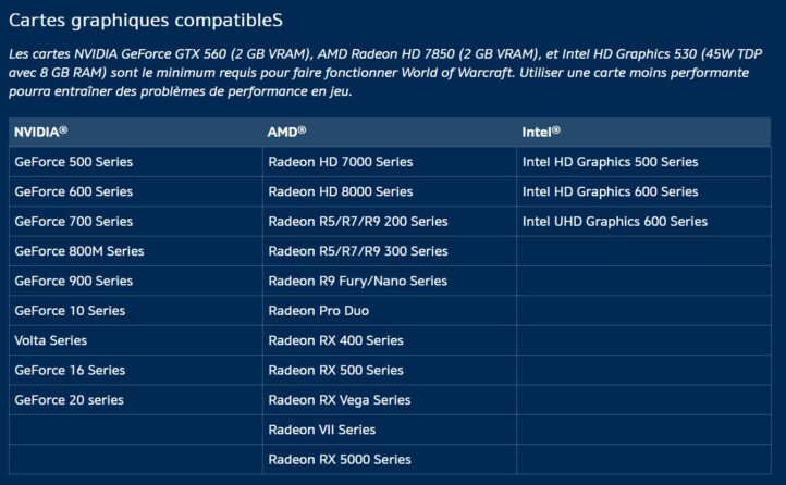 Vous pouvez également retrouver la liste de toutes les cartes graphiques compatibles avec World of Warcraft.
