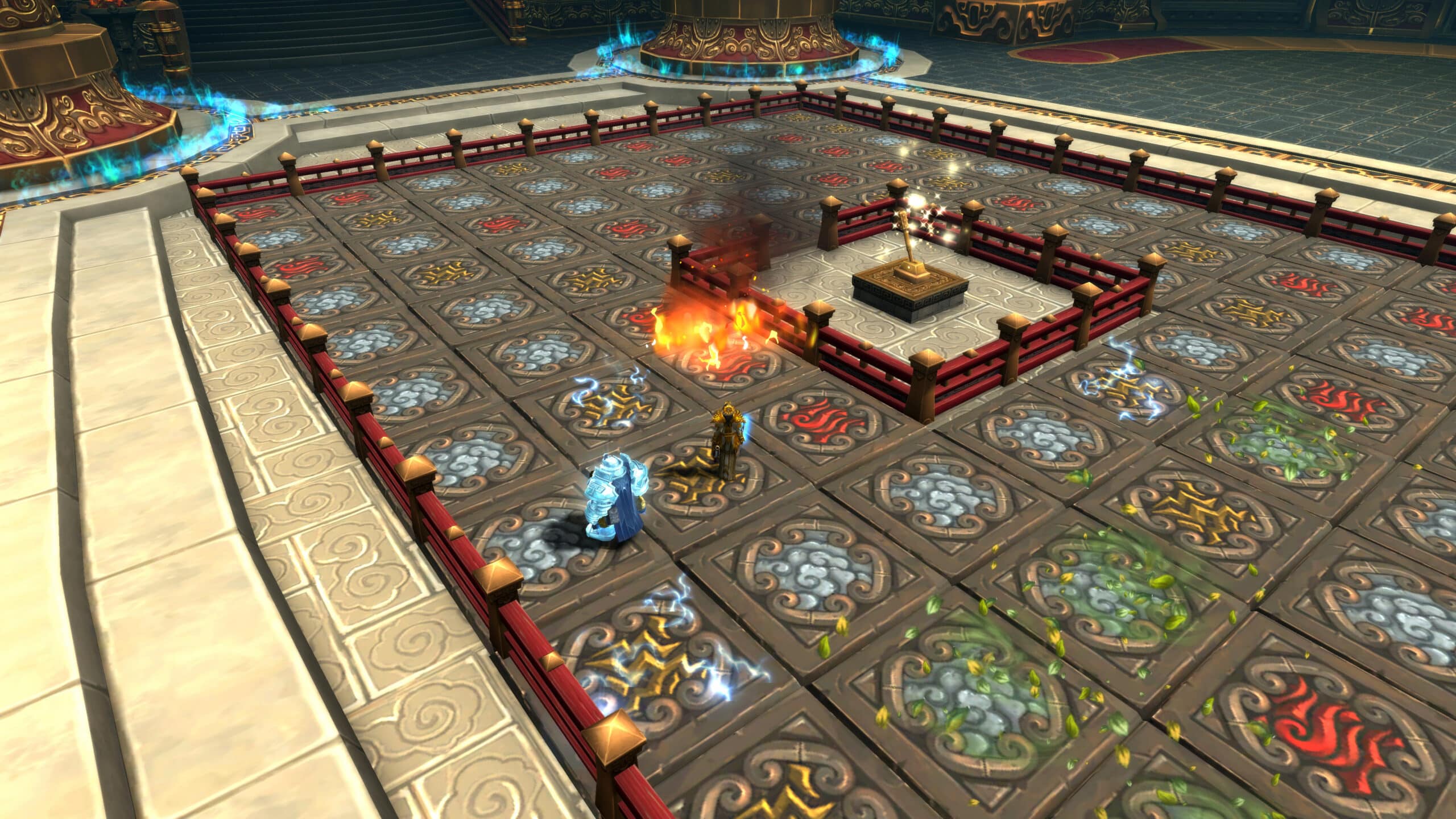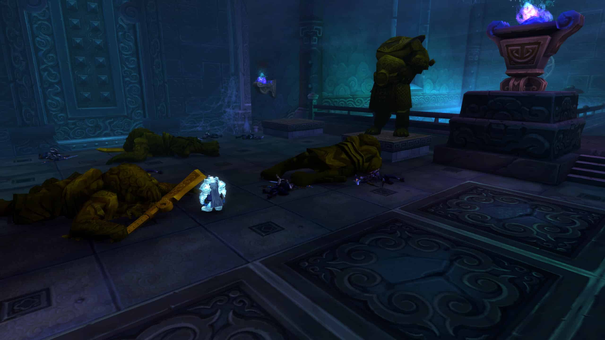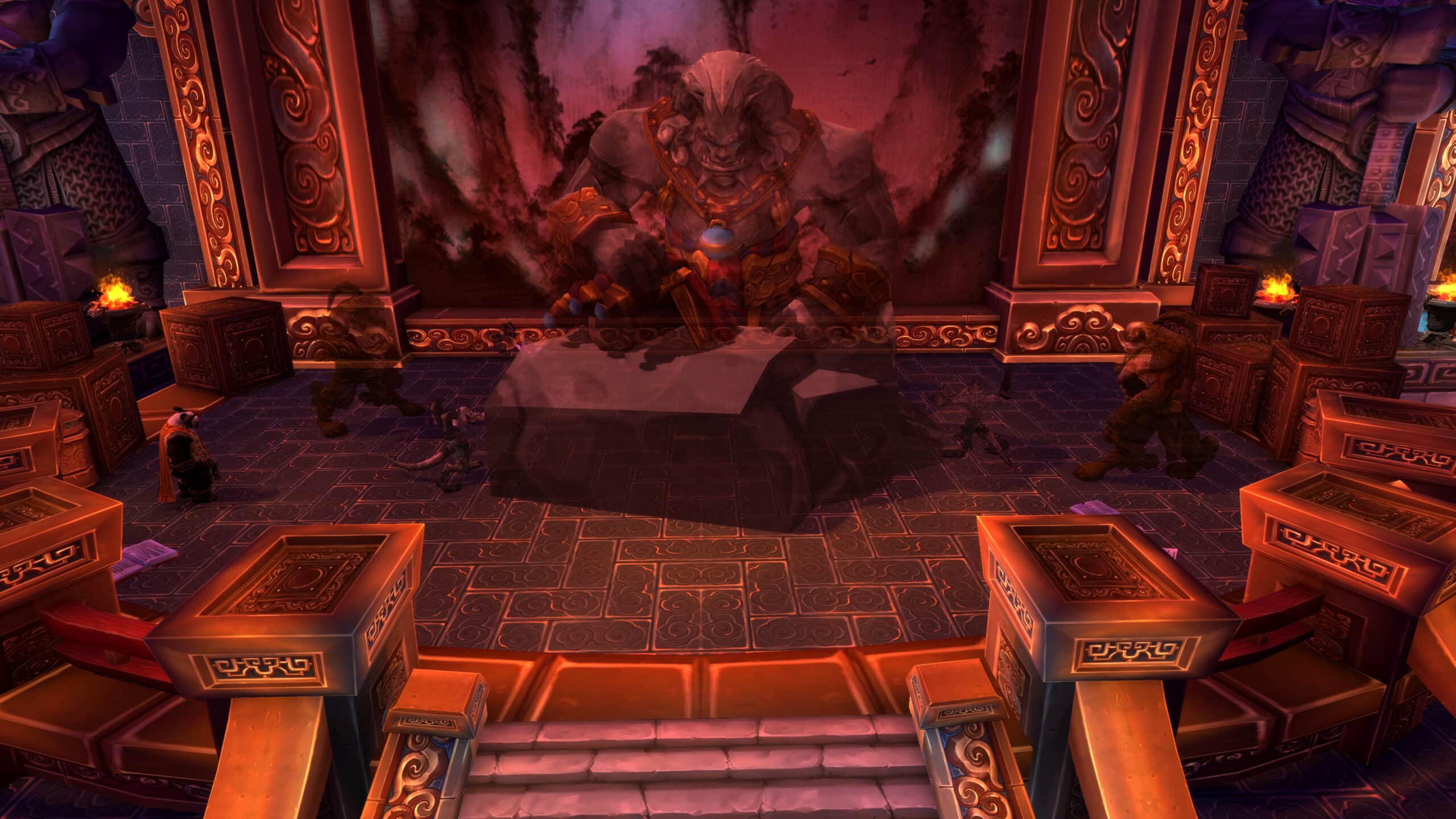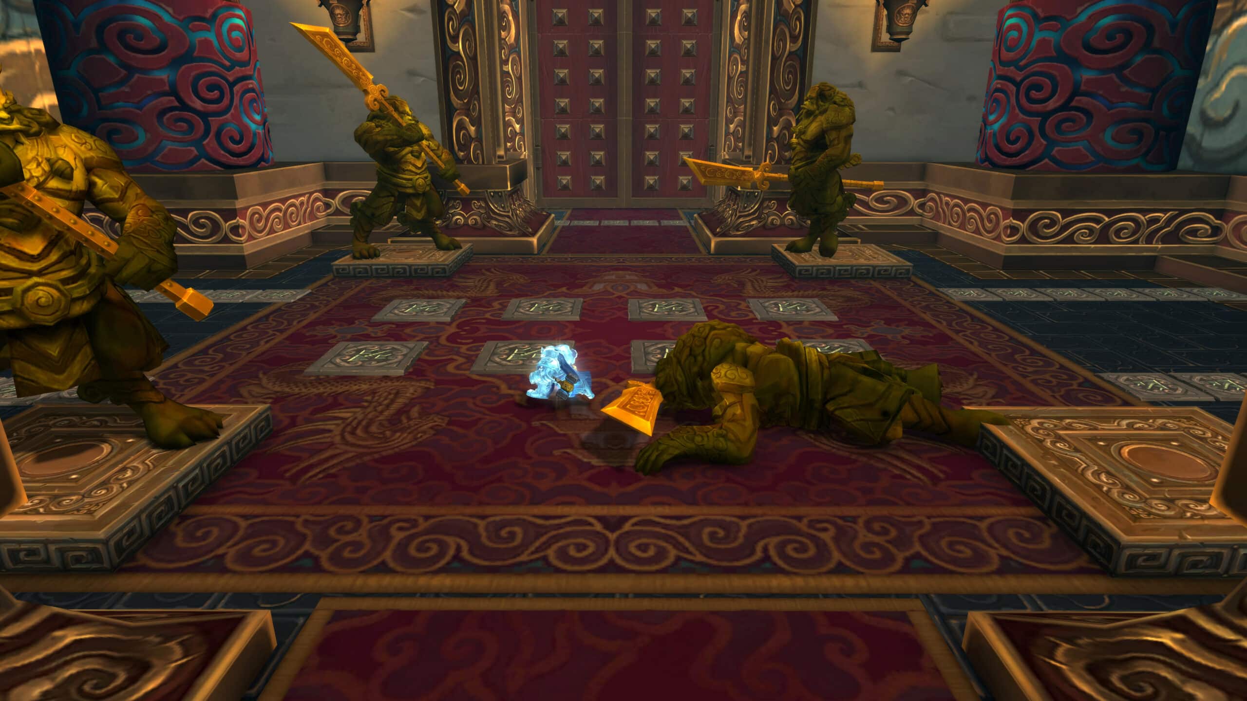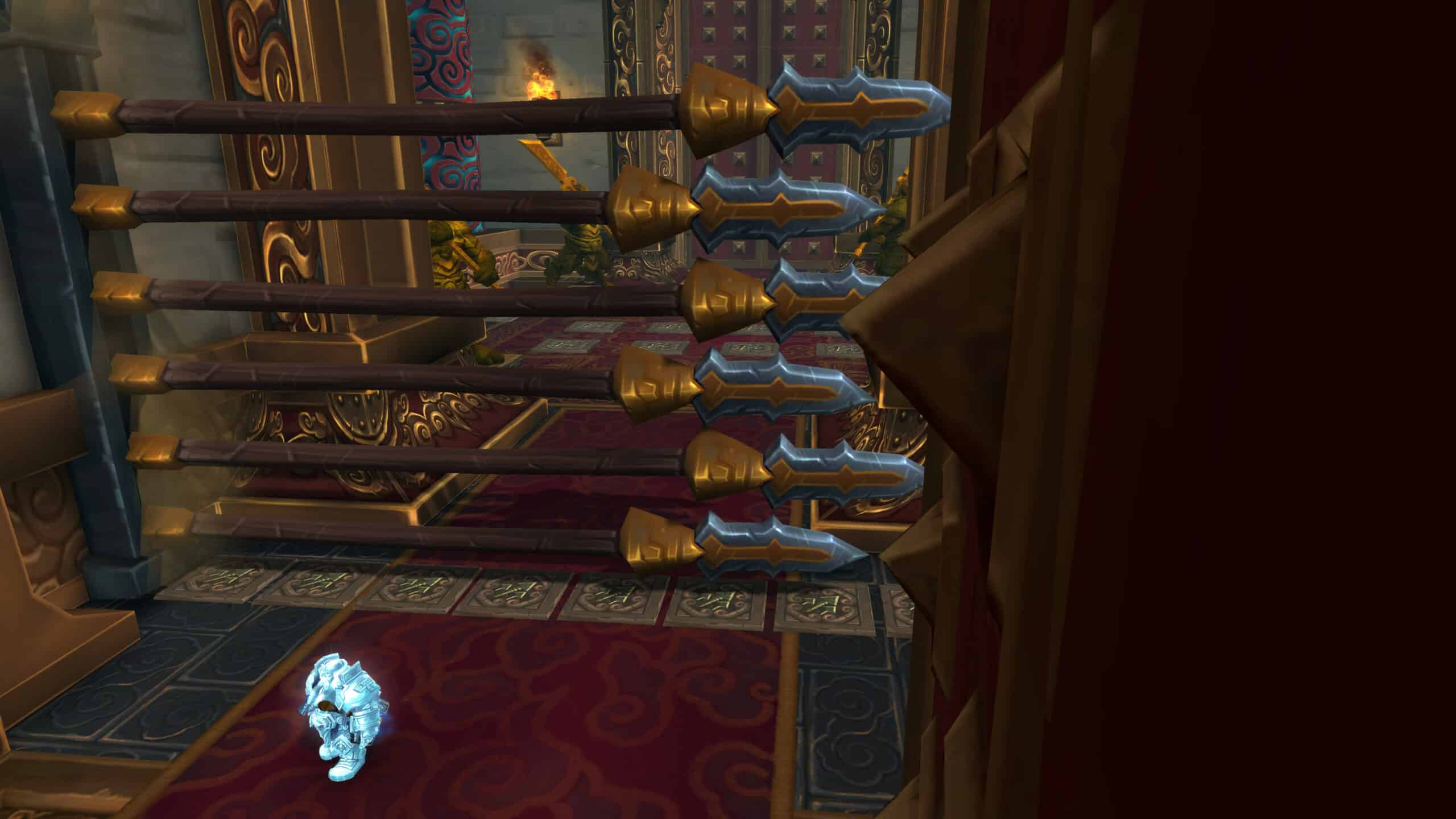 À l'intérieur du palais Mogu'shan, le clan des Mogu a tendance à poser des pièges pour les intrus imprudents. Les statues inanimées deviennent actives à tour de rôle pour défendre les trésors inestimables du clan. Au fur et à mesure de la progression jusqu'au levier ancien de la salle de l'Assemblée cramoisie, les dalles activent des flèches, flammes, éclairs ou tornades en fonction de leur symbole lorsqu'elle est enfoncée sous le poids de l'aventurier. Ce levier active l'escalier vers le passage Oublié. Pour ouvrir la porte scellée, les statues mogu devront être déplacées jusqu'à un socle d'activation pour garder les portes ouvertes.