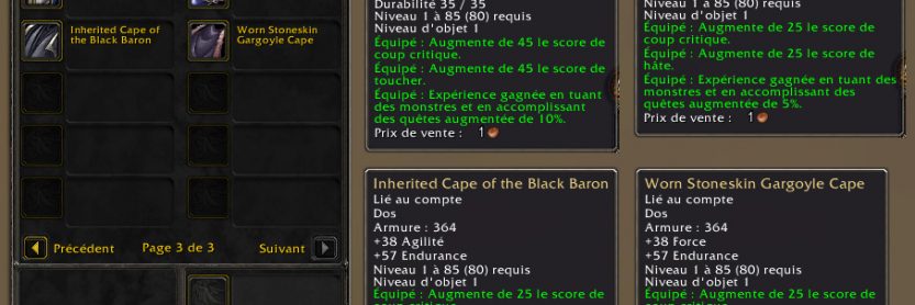 Depuis la mise à jour de cette nuit, il est possible de découvrir quelques objets sur les vendeurs de guildes. Ces objets pourront se débloquer en fonction du niveau de la guilde, ou encore en fonction de votre réputation avec la guilde, c’est encore trop tôt pour le savoir. Notez également que ces objets ne fonctionnent pas tous, prenez donc ces infos à titre indicatif. Sur la dernière image, vous verrez que le nouveau champ de bataille Tol Barad est apparu dans l’interface avec un chronomètre qui vous indique le temps restant avant la prochaine bataille.