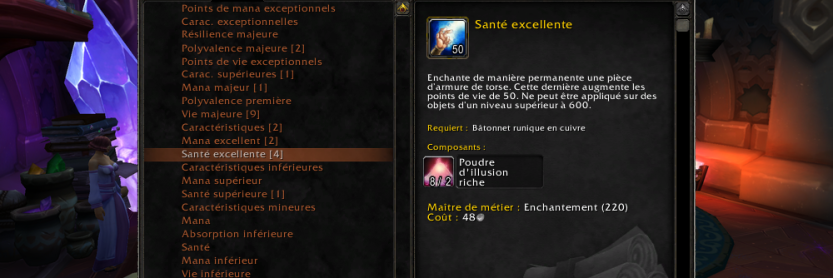 Avec le nouveau monde adapté à votre niveau dès la mise à jour 7.3.5 de Légion, le métier d'enchanteur a été retravaillé en profondeur sur les anciens composants de WoW Vanilla. La plupart des composants de cette extension ont été supprimés et convertis avec un composant unique : la poudre d'illusion riche et légère. Les divers métiers qui avaient besoin des cette liste de 16 composants supprimés comme la couture, mineur, joaillier, enchantement, alchimie et forge sont affectés par cette transformation avec des ajustements sur les recettes de métier. L'extension WoW Vanilla ne possède désormais plus que 8 composants au maximum avec un palier au niveau 20 et niveau 60, ce qui va permettre de pouvoir progresser ce métier plus aisément.