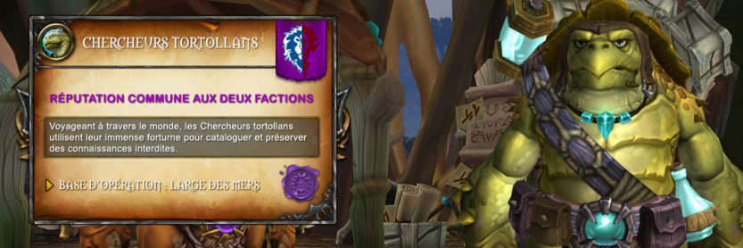 L'extension Battle for Azeroth introduit 10 nouvelles réputations uniques avec 4 factions exclusives à Kul Tiras et Zandalar et 2 factions neutres avec les chercheurs tortollans et les champions d'Azeroth. Ci-dessous, on vous propose de découvrir toutes les informations concernant la réputation des Chercheurs tortollans commune aux deux factions. Cette faction voyagent à travers le monde pour préserver leurs connaissances aux futures générations. Les Chercheurs tortollans permettent d'obtenir une nouvelle mascotte tortue, des pièces d'équipement de 325 à 355 de niveau d'objet et des recettes de métiers en calligraphie, cuisine, alchimie enchantement et couture.