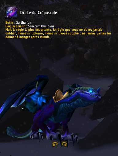 Rênes du drake du Crépuscule. Bien entendu ces deux montures, ont un taux de loot de 100%. Si c'est pas une bonne nouvelle ça?