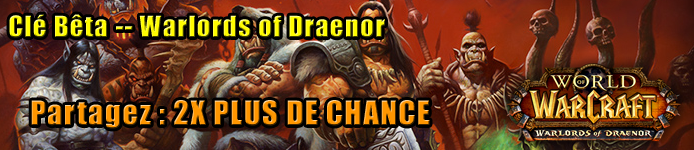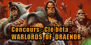 Une poignée de quelques semaines nous sépare désormais de l'ouverture officielle du nouveau continent "Draenor" avec la prochaine extension de World of Warcraft. Les plus chanceux peuvent déjà fouler les terres de ce monde somptueux... tandis que les plus malchanceux salivent à propos du contenu de Warlords of Draenor. Hosensei, membre de la communauté, nous a fait le précieux don de faire remporter une clé bêta pour Warlords of Draenor que nous mettons en jeu grâce à un petit concours. Ce concours se déroule sur nos réseaux sociaux dont les modalités de participation sont expliqués à la suite de cet article.
